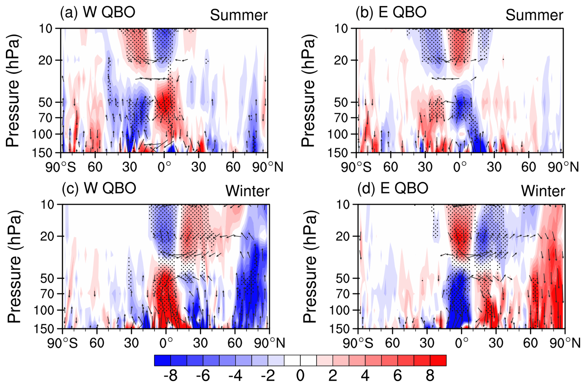 Under the westerly phase of the QBO in northern winter, the lower stratospheric residual circulation sinks in the tropics and rises in the subtropics. The middle stratospheric residual circulation rises in the tropics and sinks in the northern hemisphere subtropics (Fig. 8c). Under the QBO easterly phase in the northern winter, the lower stratosphere vertical residual velocity anomaly shows upwelling in the tropics and sinking in the northern hemisphere subtropics with the ascending branch in the tropics being stronger. The residual circulation in the middle stratosphere sinks in the tropics and rises in the northern hemisphere subtropics (Fig. 8d).