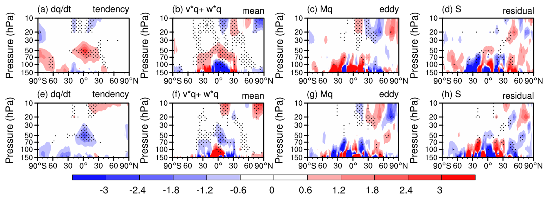 The transformed Eulerian-Mean (TEM) tracer continuity equation is used to quantify the balance of stratospheric water vapor associated with the QBO. Since the water vapor QBO is stronger in northern winter, the TEM diagnosis for the northern winter is shown in Fig. 9. Under the QBO westerly phase, the tropical water vapor shows a positive tendency between 30–100 hPa (Fig. 9a), explaining the water vapor anomalies. The first two terms on the right side of Eq. (1) are the mean transport of water vapor by the residual circulation (Fig. 9b). The change of mean advection of water vapor is basically consistent with the tendency of water vapor in the tropical region. Positive anomalies are observed at the 30–100 hPa stratosphere. However, in the tropical lower stratosphere, the positive anomaly of the mean advection is smaller than that of the water vapor tendency (Fig. 9b). In the tropics, the meridional and the vertical mean advections together constitute the mean advection term (Fig. S6). Namely, the residual circulation explains partially the water vapor variation in the tropical stratosphere. The transport of water vapor by the eddy advection occurs mainly in the northern hemisphere (Fig. 9c) and is counterbalanced by the residual term (Fig. 9d). It is worth noting that at the bottom of the tropical stratosphere, the residual term generates positive water vapor anomalies, associated with increase in the cold point temperature of the tropical tropopause under the QBO westerly phase (Fig. 9d). The tendency, mean advection and eddy advection of water vapor during the QBO easterly phase in the northern winter (Fig. 9e, f, g) are generally opposite to those during the QBO westerly phase. The residual item, including the net chemical production, the evaporation and sublimation, and the condensation and deposition, also exhibits negative water vapor anomalies in the tropical lower stratosphere (Fig. 9h). Through the above analysis, it can be found that the QBO influences tropical stratospheric water vapor variations primarily through two mechanisms. One is the mean advection term of the residual circulation, and the other is the tropopause cold point temperature that exerts influence on stratospheric water vapor entry.