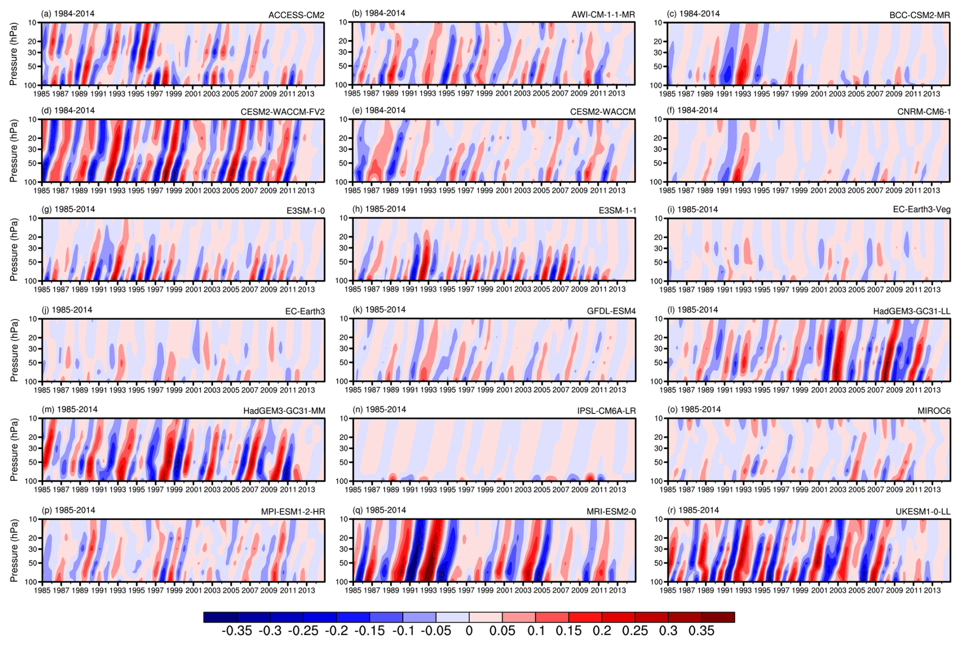 Figure 10Historical simulation of water vapor QBO for (a–r) 18 CMIP6 models. stratospheric water vapor anomalies in the tropics (5° S–5° N) during 1985–2014 have been bandpass filtered to focus on periodicities between 15 and 60 months (mass mixing ratio, units: ppm).