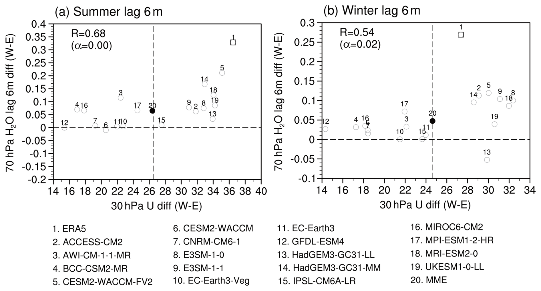 Previous work has suggested that models with a stronger QBO in the lower stratosphere are better capable of simulating its effect on entry water vapor (Ziskin Ziv et al., 2022), and we now consider this effect in these 18 models. Figure 11 shows the scatter plots of QBO westerly phase minus easterly phase for the 30 hPa zonal wind index and 70 hPa water vapor anomalies with a lag of 6 months in deep tropics among CMIP6 models. Compared with the CMIP6 models, the 70 hPa water vapor lagging by six months in ERA5 reanalysis is significantly larger. In the northern summer, the CMIP6 high-top models can simulate the positive correlation between the 30 hPa QBO index and water vapor lagging by six months at 70 hPa, with a multi-model correlation reaching 0.68 (p=1). Eight models simulate QBO index differences between easterly and westerly phases exceeding 30 m s−1, which are comparable to the ERA5 QBO indices, but the 70 hPa water vapor in all models are only half that in ERA5 (Fig. 11a). In winter, CMIP6 models also capture the positive correlation between the 30 hPa QBO index and the 70 hPa water vapor lagging by six months, with a multi-model correlation coefficient of 0.54 (p=0.98). Eight models show higher 30 hPa QBO index than that in ERA5, but only six of them exhibited water vapor anomalies around 0.1 ppm, with too-small water vapor amplitudes (Fig. 11b). Simulation performance is better in northern summer than in winter.