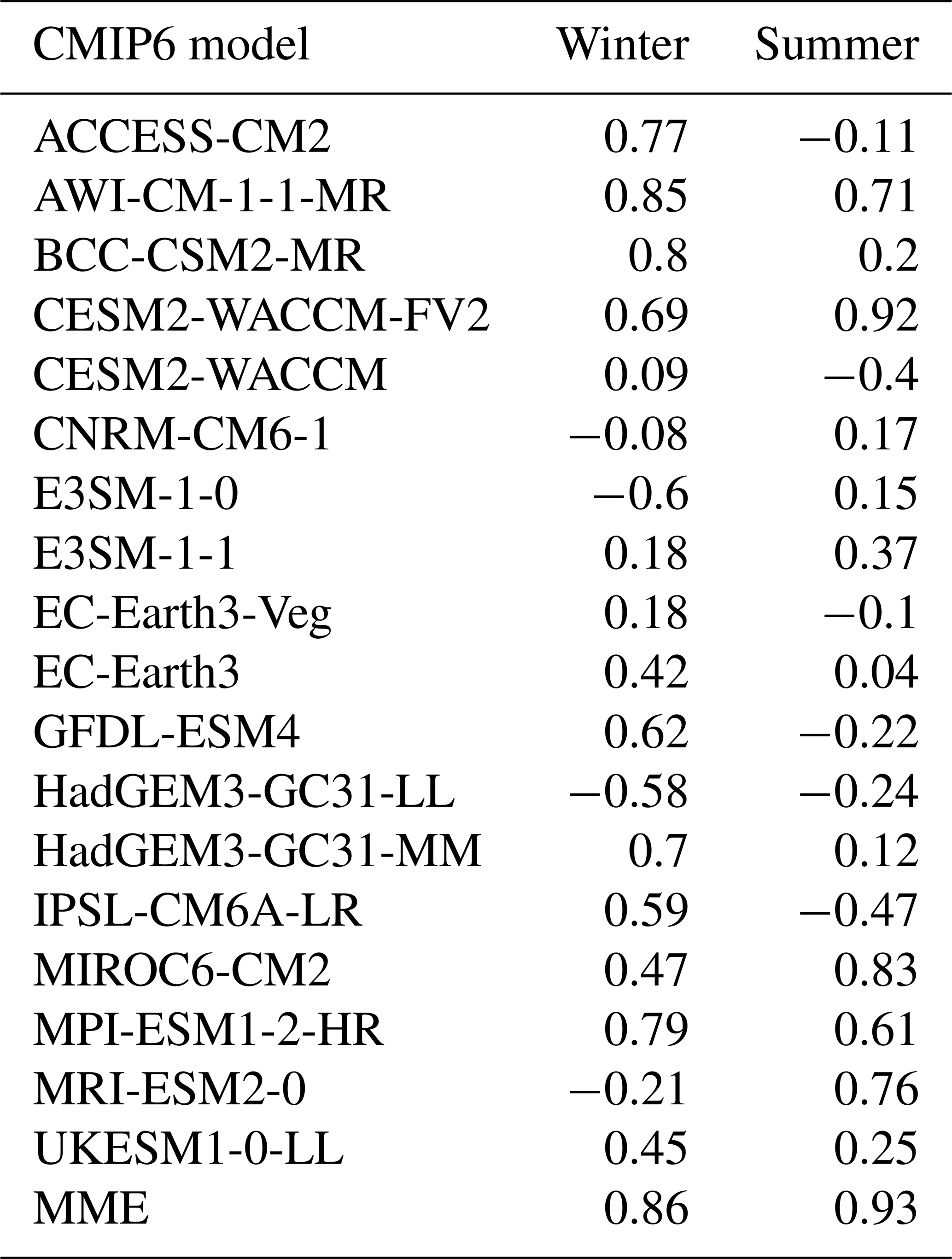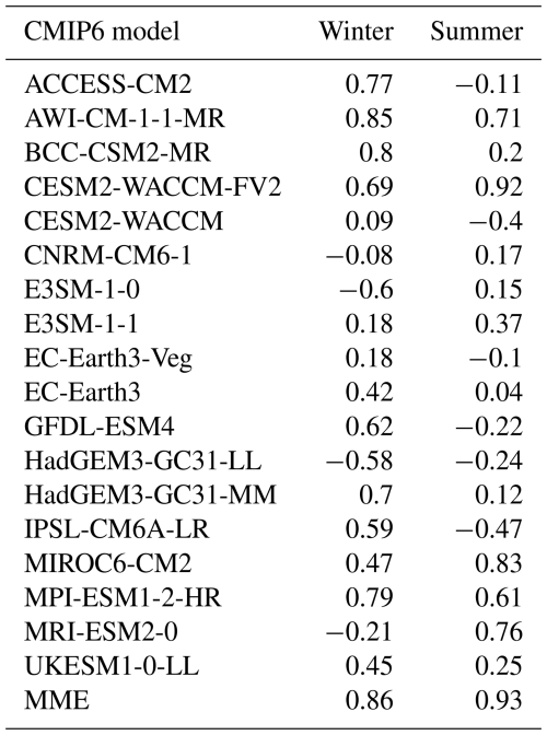 Table 1Pattern correlation between ERA5 reanalysis and CMIP6 models for WQBO minus EQBO water vapor difference at 100–30 hPa and 30° S–30° N.