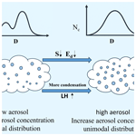 As shown in Fig. 7, when the concentration of large particles is low, increasing the concentration of small particles progressively shifts the droplet distribution from unimodal to bimodal. In contrast, at higher large particle concentrations, the trend reverses, shifting from bimodal to unimodal. When the concentration of large particles is low, the availability of CCN remains limited, as in the low–small-particle case concentrations. Increasing concentrations of small particles provide additional CCN, thus intensifying vapor competition, i.e., more droplets are formed, but their growth into larger sizes is inhibited. As aerosol concentrations continue to increase, enhanced vapor competition further restricts the formation of large droplets, concentrating cloud particles in the small range and resulting in a unimodal distribution.