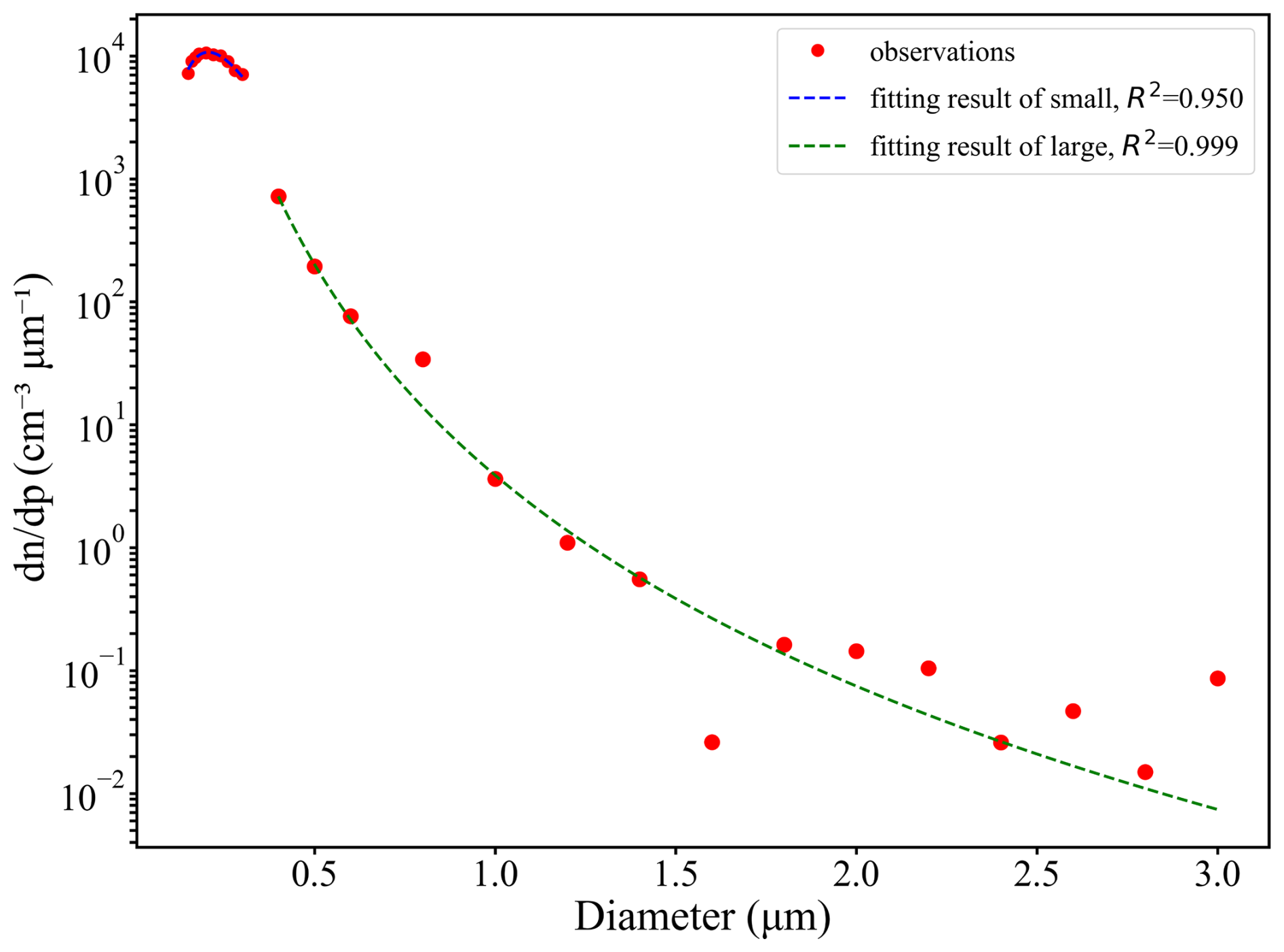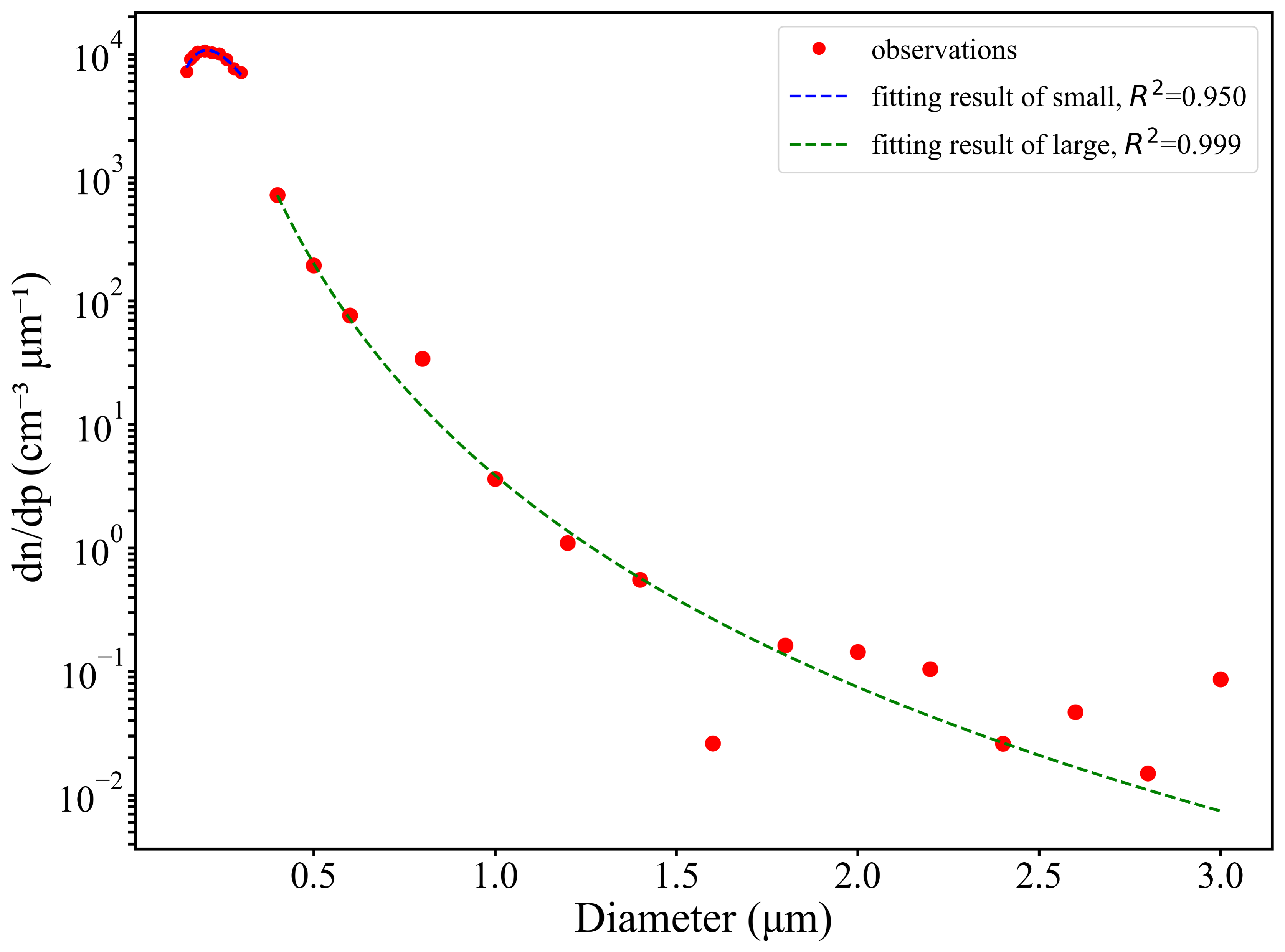 Figure 2Aerosol size distribution at cloud base fitted from in situ observations: red dots represent measured values, dashed lines show the fitted curves, blue indicates small particles, and green indicates large particles.