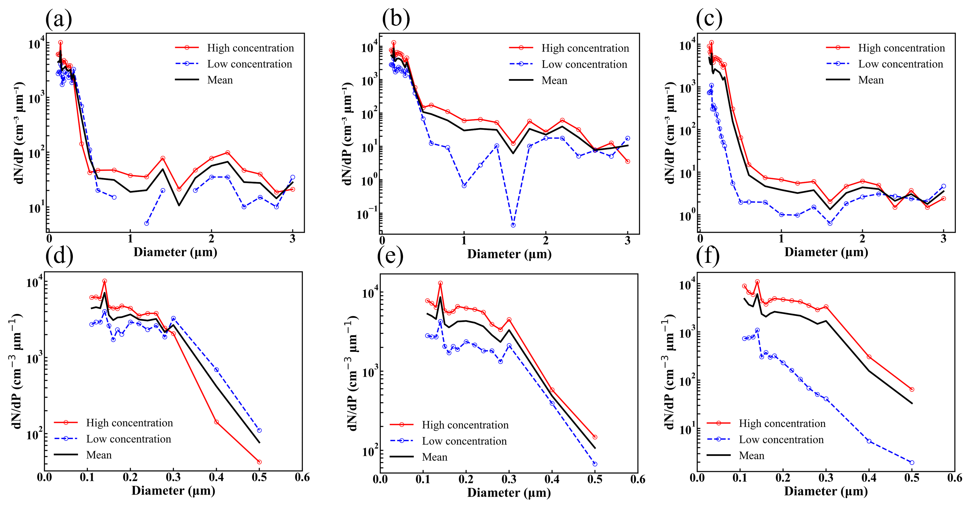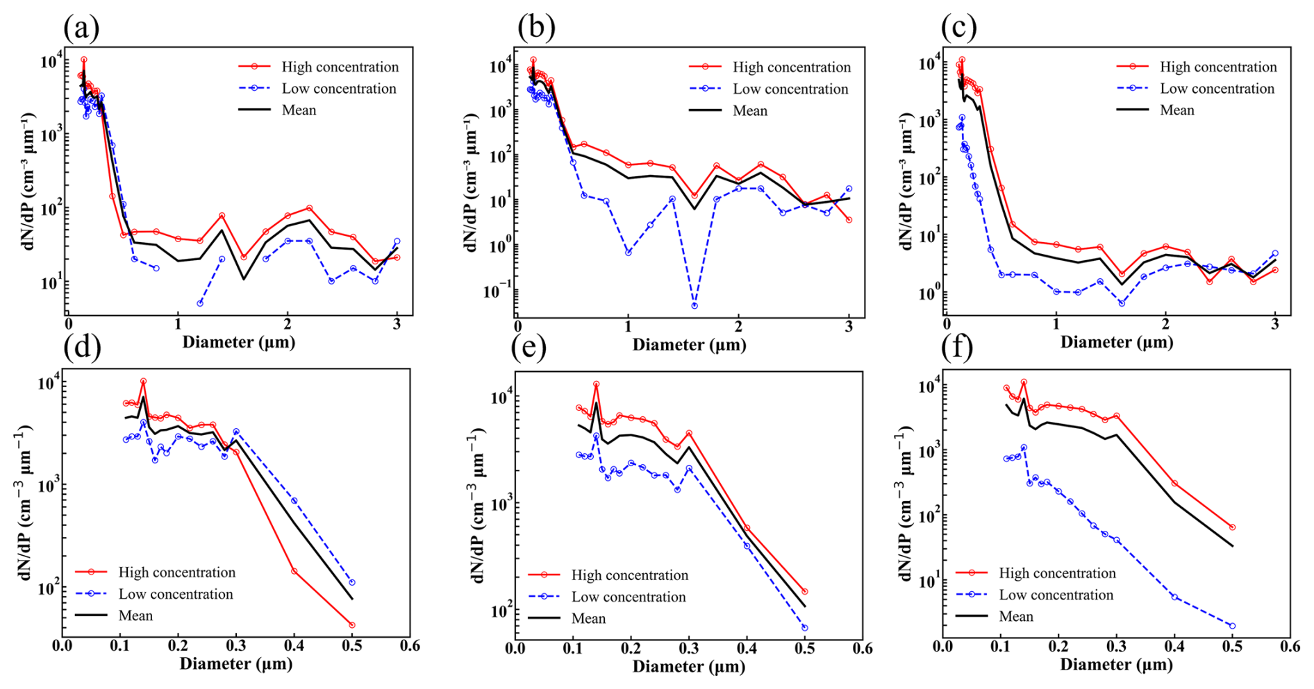 Figure 3Aerosol number size distributions below the observed clouds under different aerosol loading conditions. Panels (a–c) show the aerosol size distributions below warm, mixed-phase, and ice clouds, respectively, under high and low aerosol loading, along with the mean distribution (black line). Panels (d–f) present a zoomed-in view of the small-size range. The red and blue curves represent high- and low-aerosol conditions, respectively.