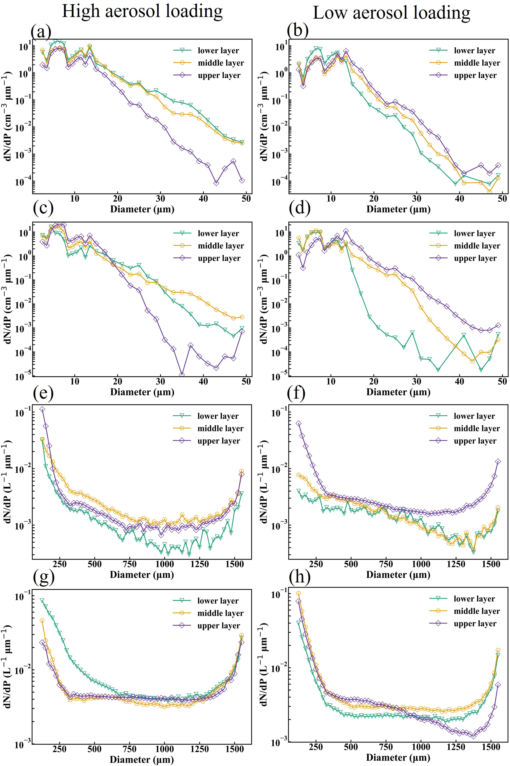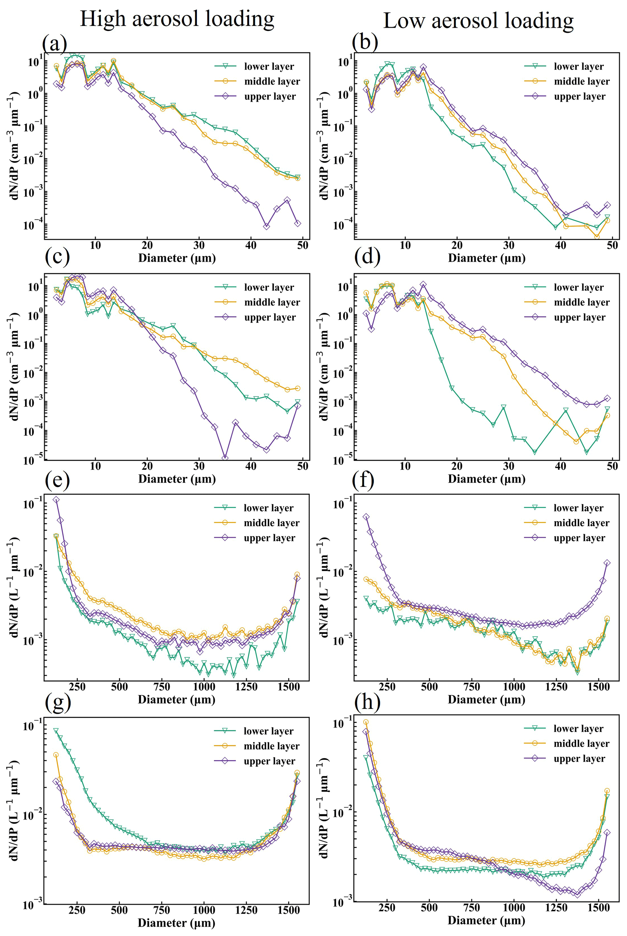 Figure 4Size distributions of cloud particles in different regions of the observed clouds under high and low aerosol loading conditions. The left column (a, c, e, g) corresponds to high aerosol loading, and the right column (b, d, f, h) corresponds to low aerosol loading. Panels (a, b) show cloud droplet spectra in warm clouds; panels (c, d) show cloud droplet spectra in mixed-phase clouds; panels (e, f) show ice crystal spectra in mixed-phase clouds; and panels (g, h) show ice crystal spectra in ice clouds. In each panel, the green, yellow, and purple curves represent the lower, middle, and upper layers of the cloud, respectively.