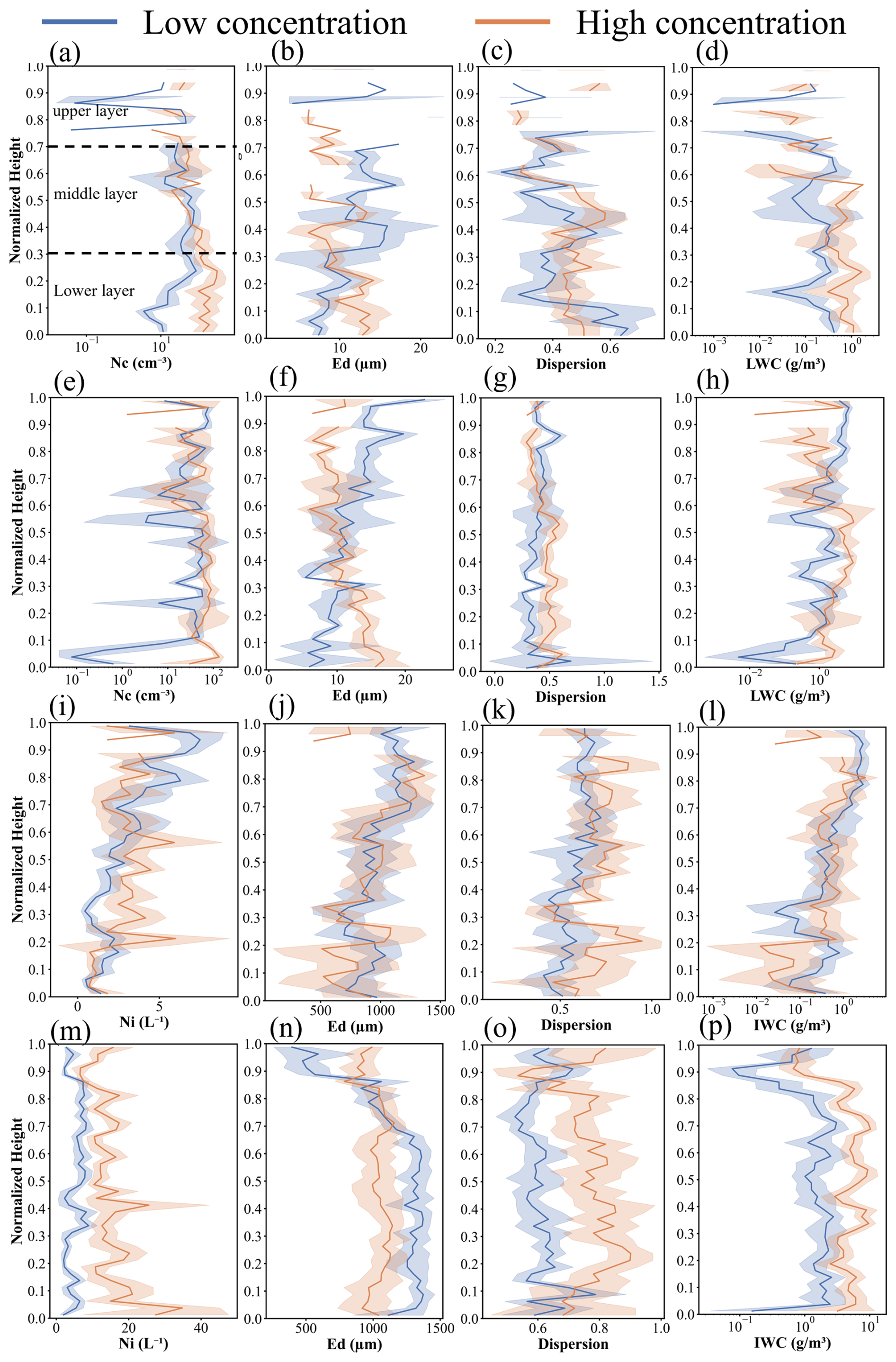 Figure 5Vertical distributions of different cloud particle characteristics. (a–d) Water cloud droplets, (e–h) mixed-phase clouds droplets, (i–l) ice crystals in mixed clouds, (m–p) ice crystals in ice clouds. For each cloud type, the panels from left to right represent number concentration, effective diameter, dispersion, and water content, respectively.