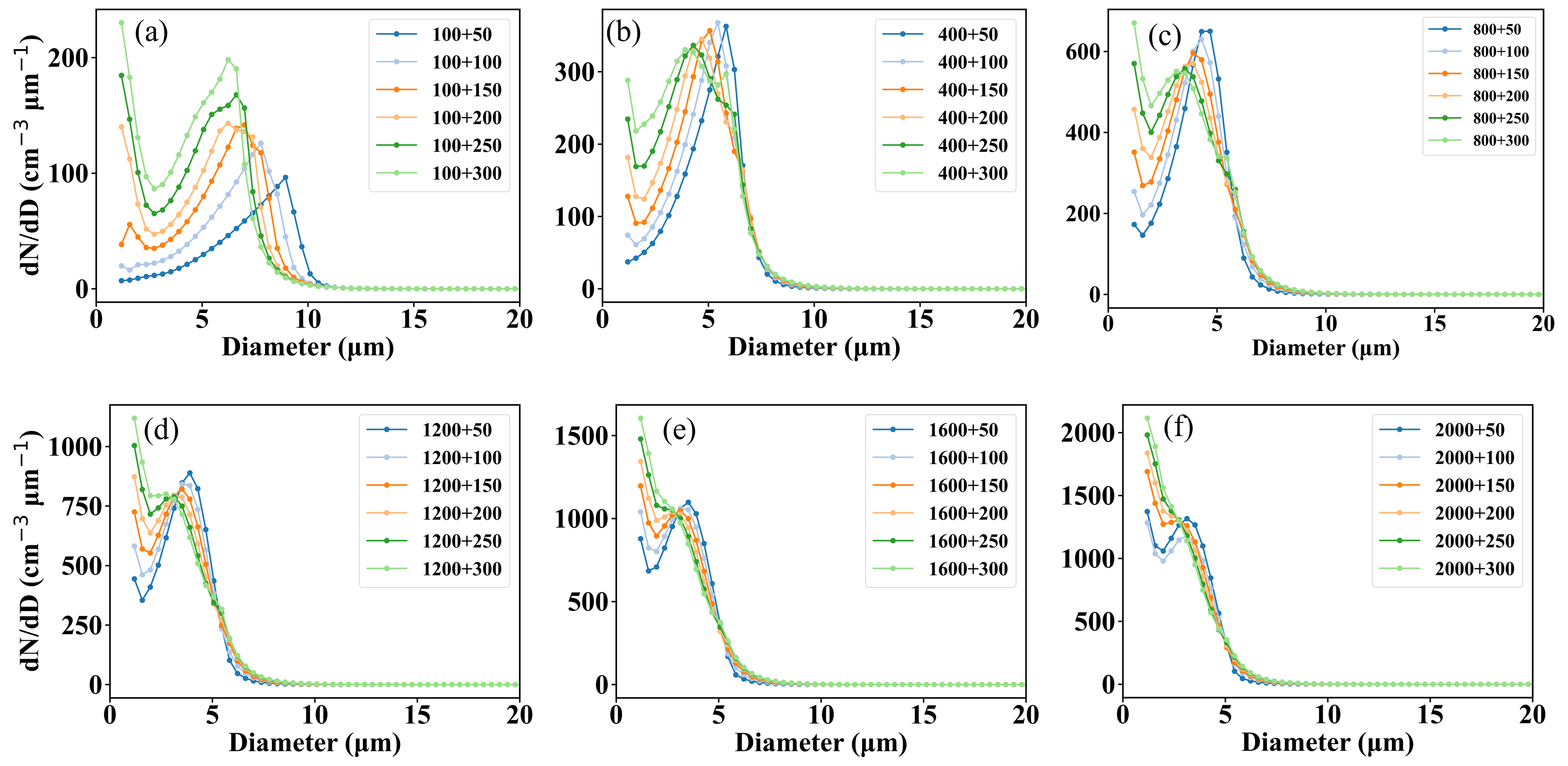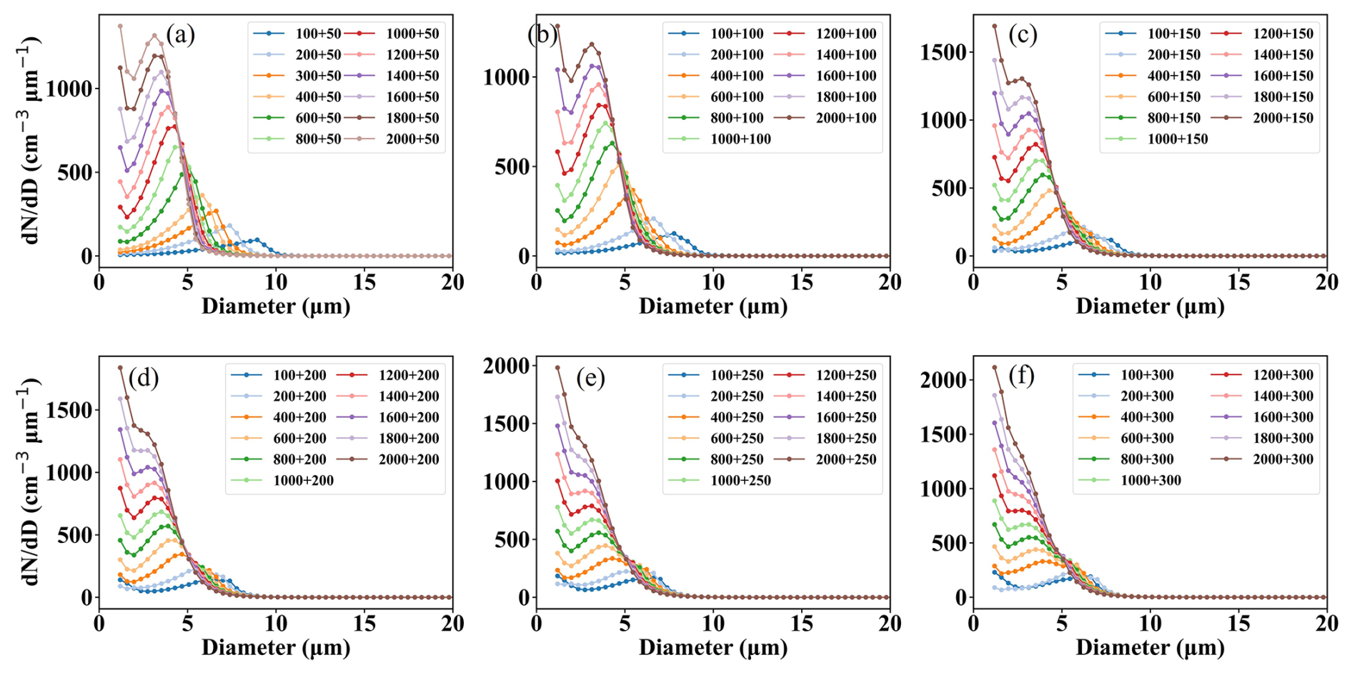 Figure 6Cloud droplet size distributions under varying concentrations of large particles with fixed concentrations of small particles. The concentrations of small particles are (a) 100, (b) 400, (c) 800, (d) 1200, (e) 1600, and (f) 2000 cm−3. In the legend, the notation “x+y” denotes the concentrations of small particles (x) and large particles (y), respectively.