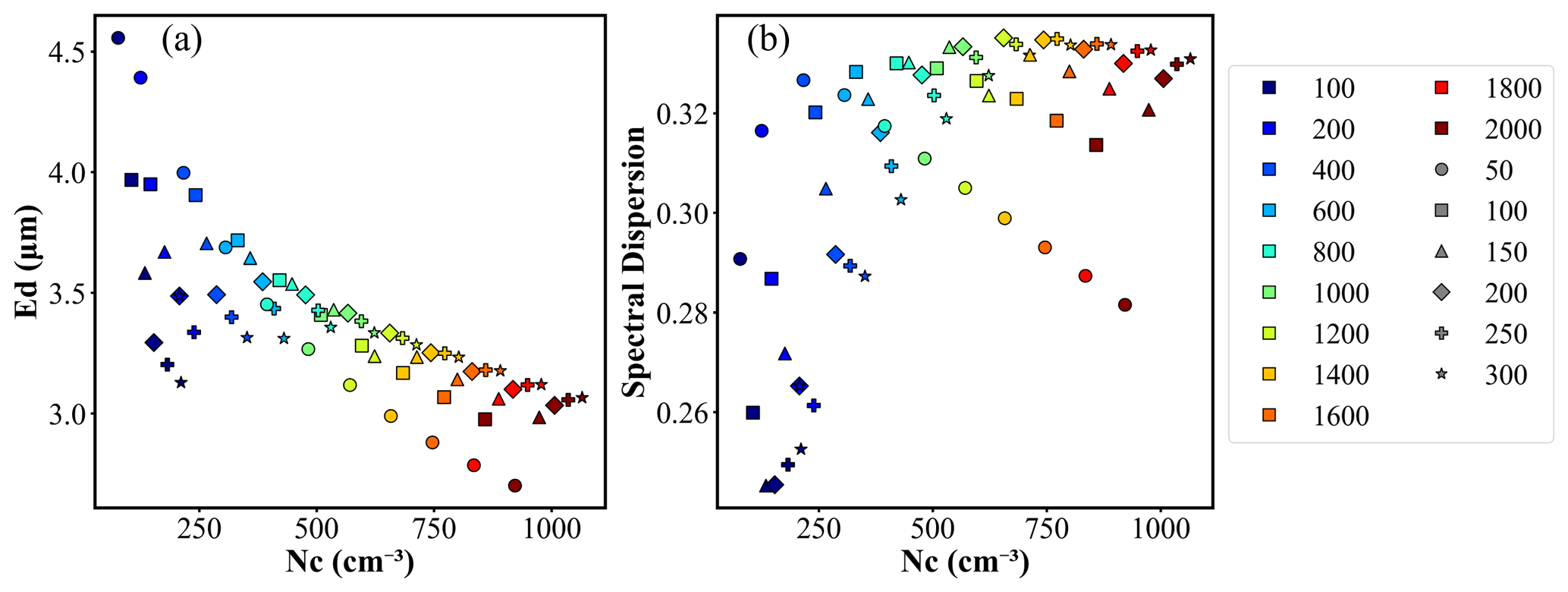 Figure 8Scatter plot of the cloud droplet effective diameter (Ed), droplet spectral dispersion, and droplet number concentration (Nc) at cloud base. The marker color represents the concentration of small particles, and the marker shape represents the concentration of large particles.