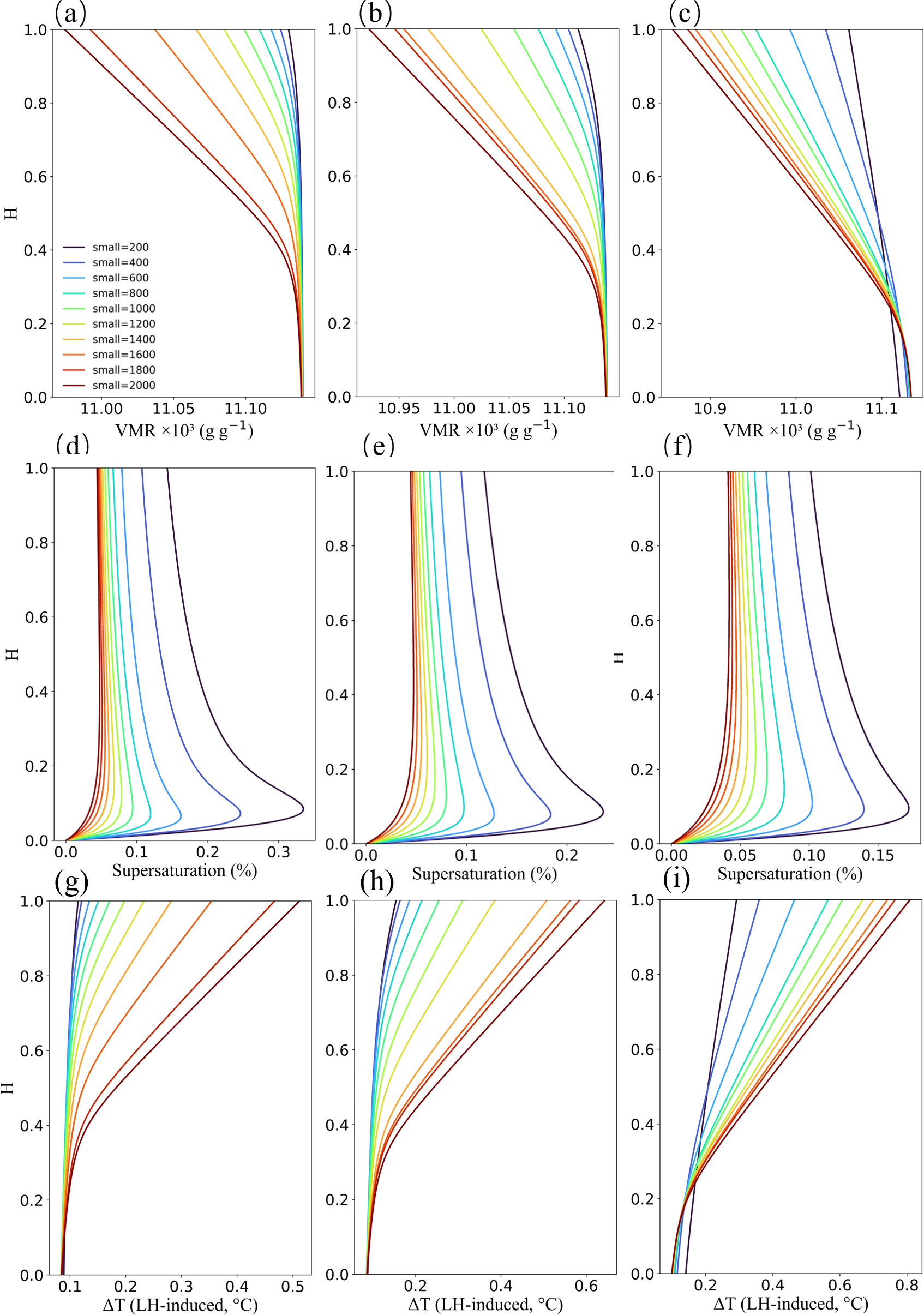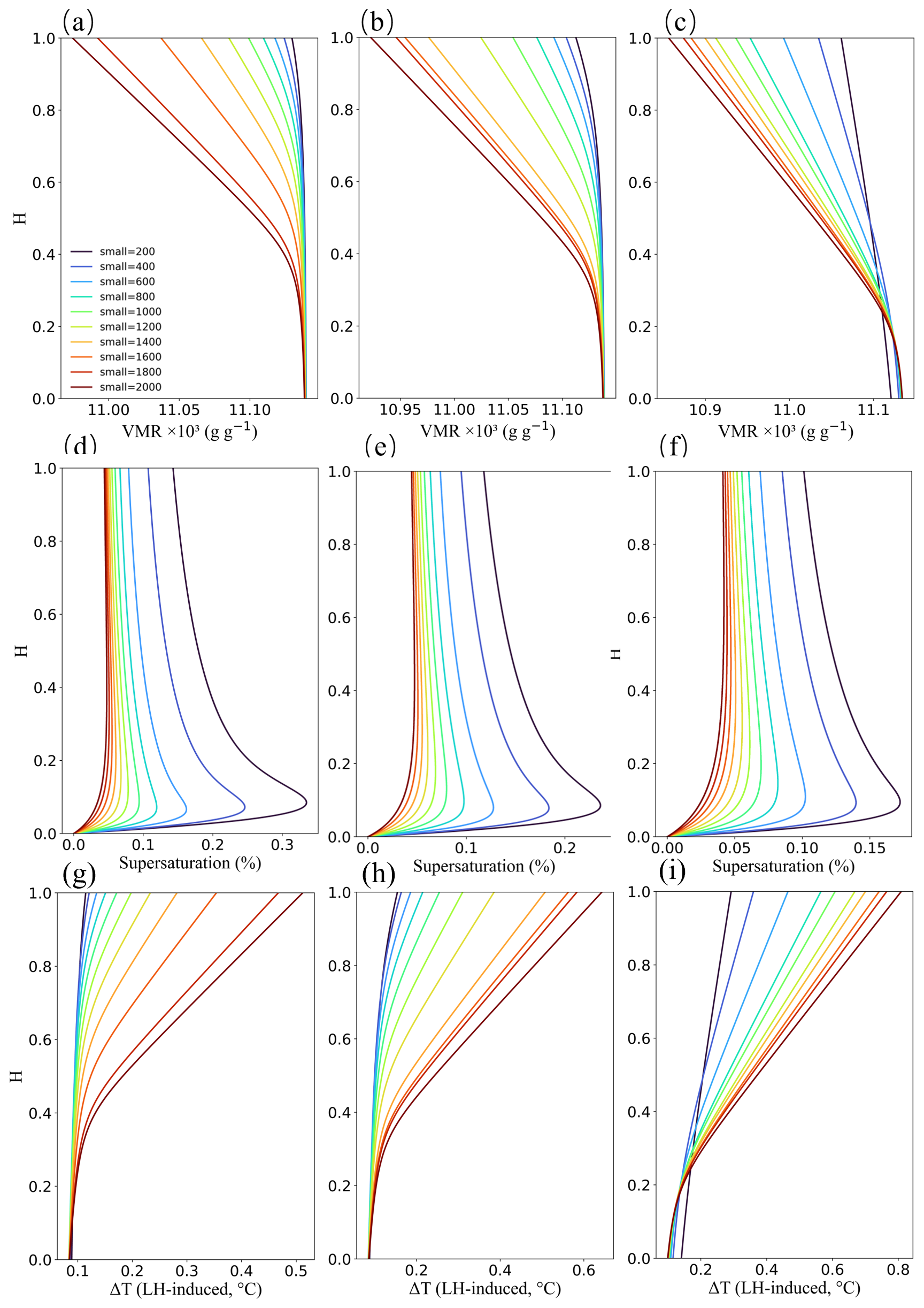 Figure 9Vertical profiles of cloud water vapor mixing ratio (VMR) (a–c), supersaturation (e, f), and condensation-induced environmental warming (g–i) under different aerosol concentrations. Colored curves represent different aerosol concentrations, and the vertical coordinate H denotes the normalized cloud height.