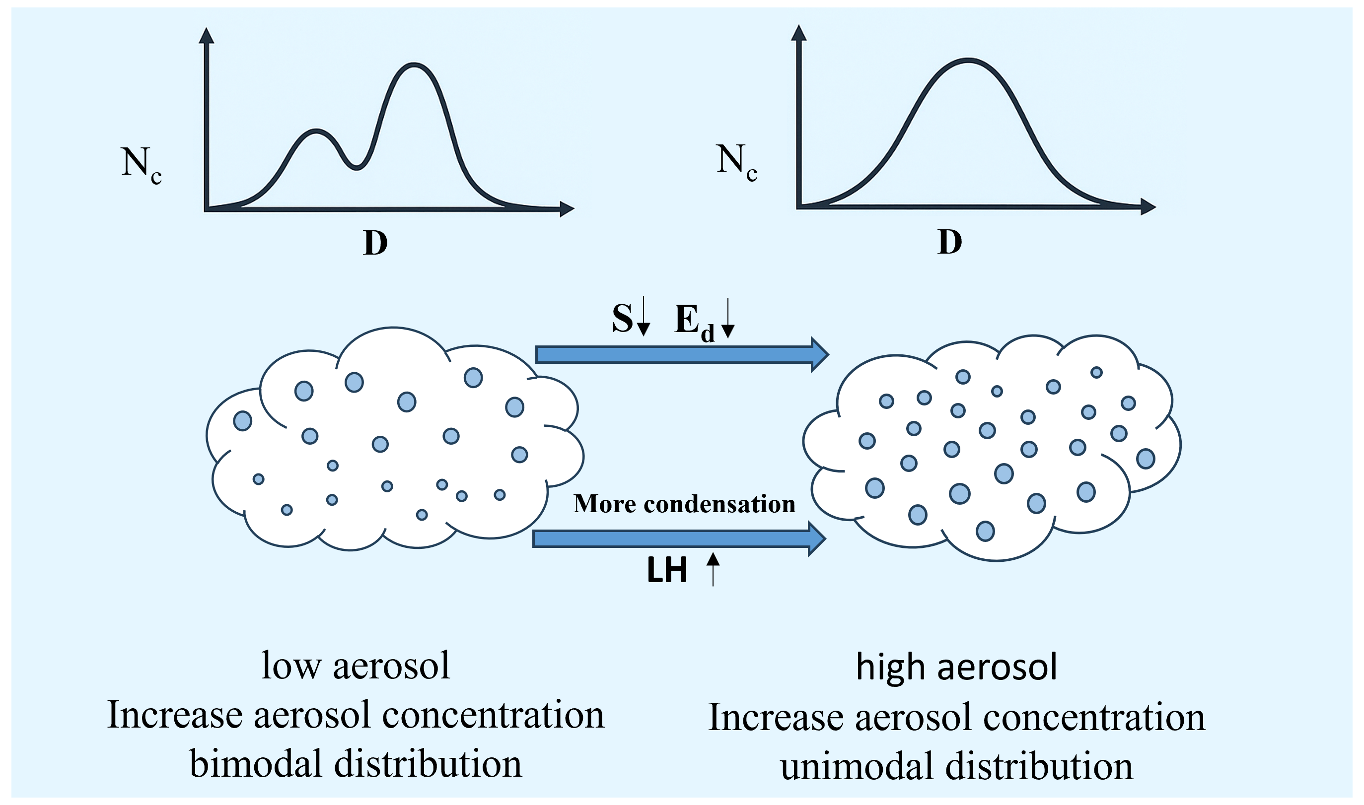 Figure 10Conceptual illustration of the effects of low and high subcloud aerosol concentrations on cloud droplet properties.
