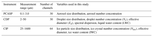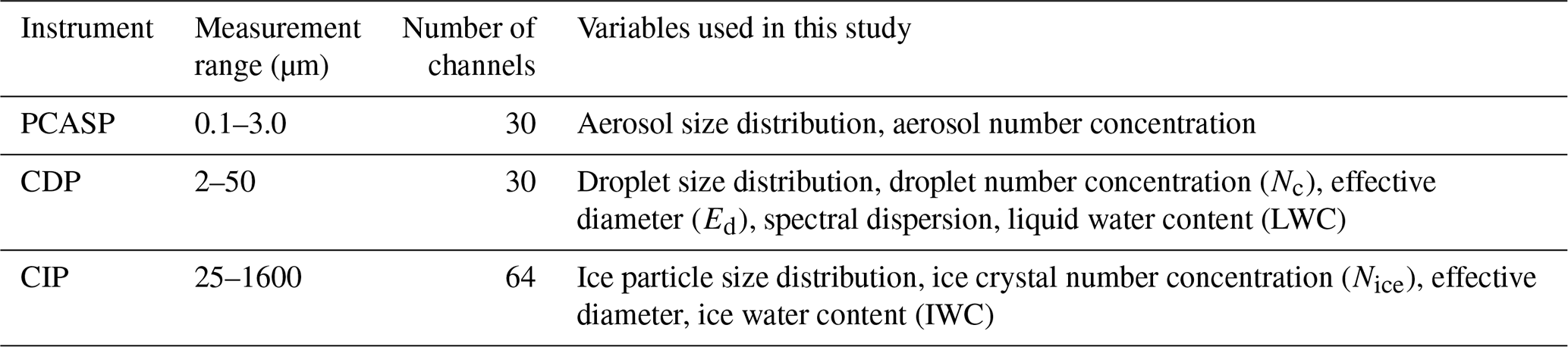 The CDP provides detailed measurements of cloud droplet number concentrations, size distributions, and liquid water content (LWC) (Faber et al., 2018). Single-particle light scattering is used to determine the diameter of individual droplets. In this study, the LWC was estimated from CDP data, whose accuracy has been previously validated (Hou et al., 2021). The CIP measures ice particle number concentrations (Ni) over a size range of 25–1550 µm (Baumgardner et al., 2001). To reduce the effects of particle shattering and to avoid ambiguities between cloud droplets and ice crystals, only particles within the 125–1500 µm range were analysed (Heymsfield and Willis, 2014 ). The PCASP measures aerosol particles ranging from 0.1 to 3 µm across 30 size channels (Strapp et al., 1992).