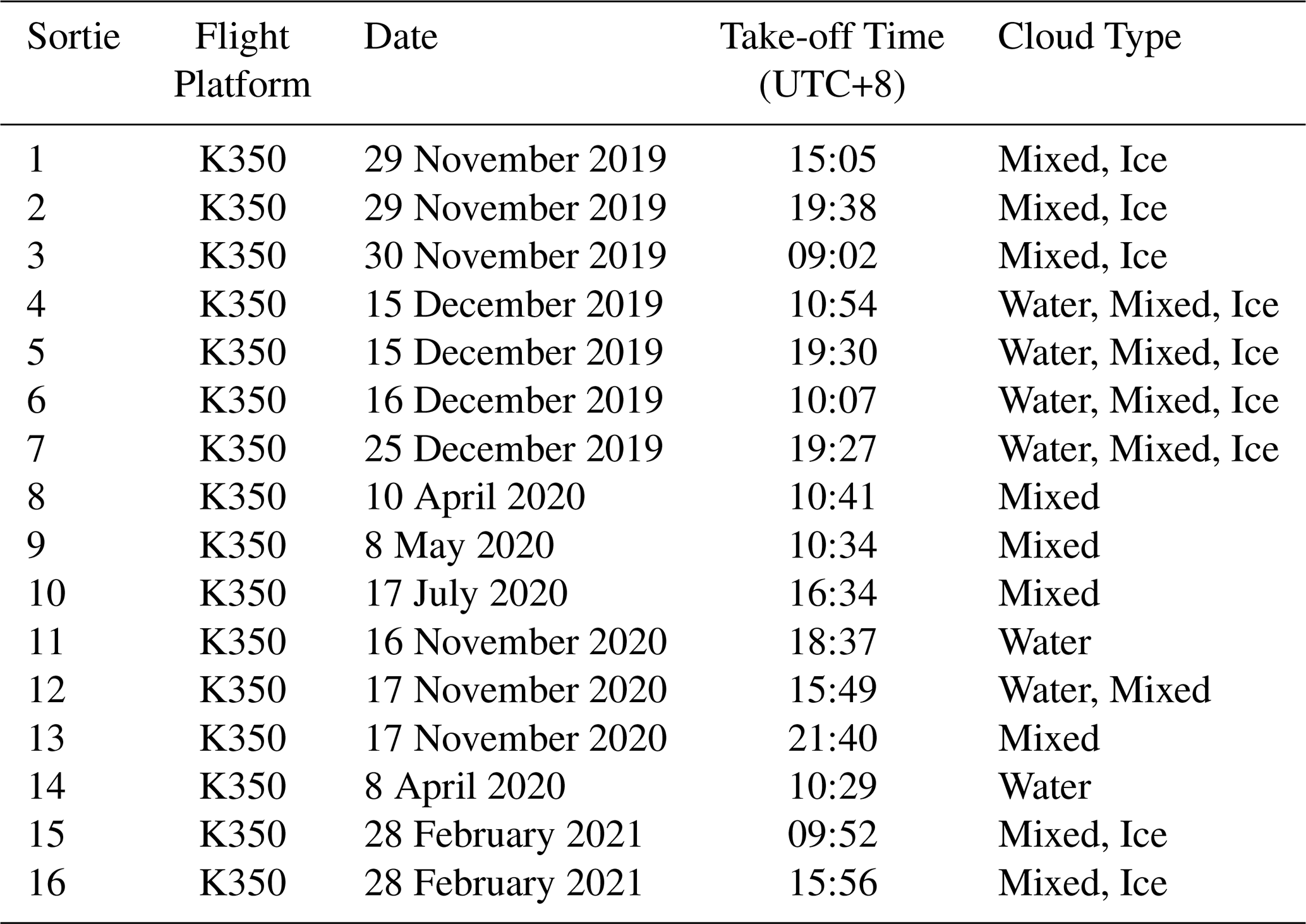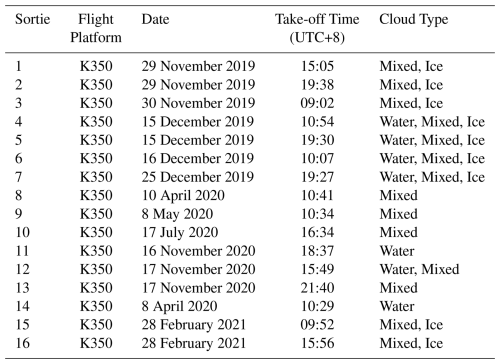Table 2Detailed information on aircraft observation sorties (individual aircraft missions) used in this study.