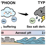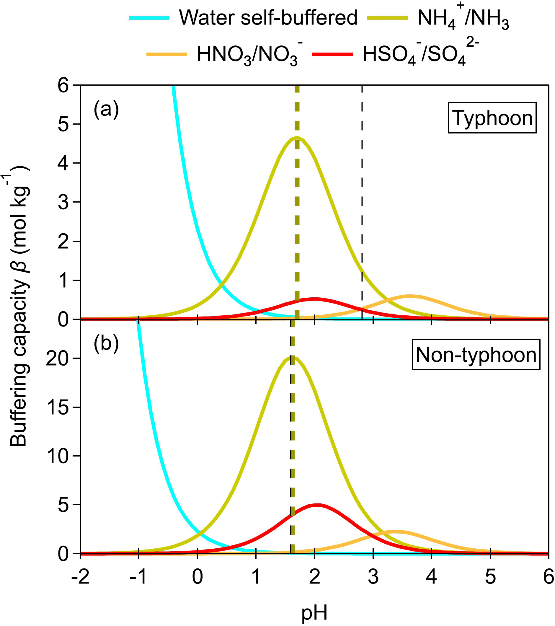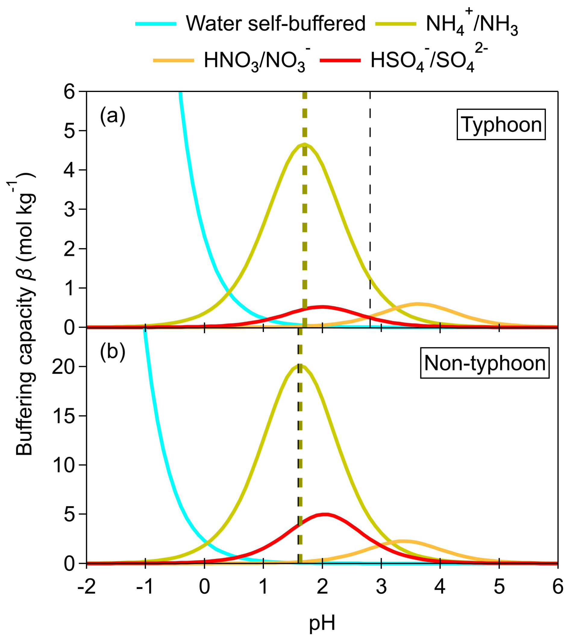 The stronger role of under non-typhoon conditions reflects the abundance of ammonia in this coastal environment and its efficient partitioning, which results in a stable buffering regime at acidic pH. However, for the typhoon scenario, the multiphase buffer theory appears to be less applicable. It should also be noted that multiphase buffer theory assumes instantaneous thermodynamic equilibrium and primarily considers inorganic conjugate acid-base pairs, while the potential contributions of organic species and kinetic effects are neglected. Such simplifications may further contribute to discrepancies under dynamic conditions.