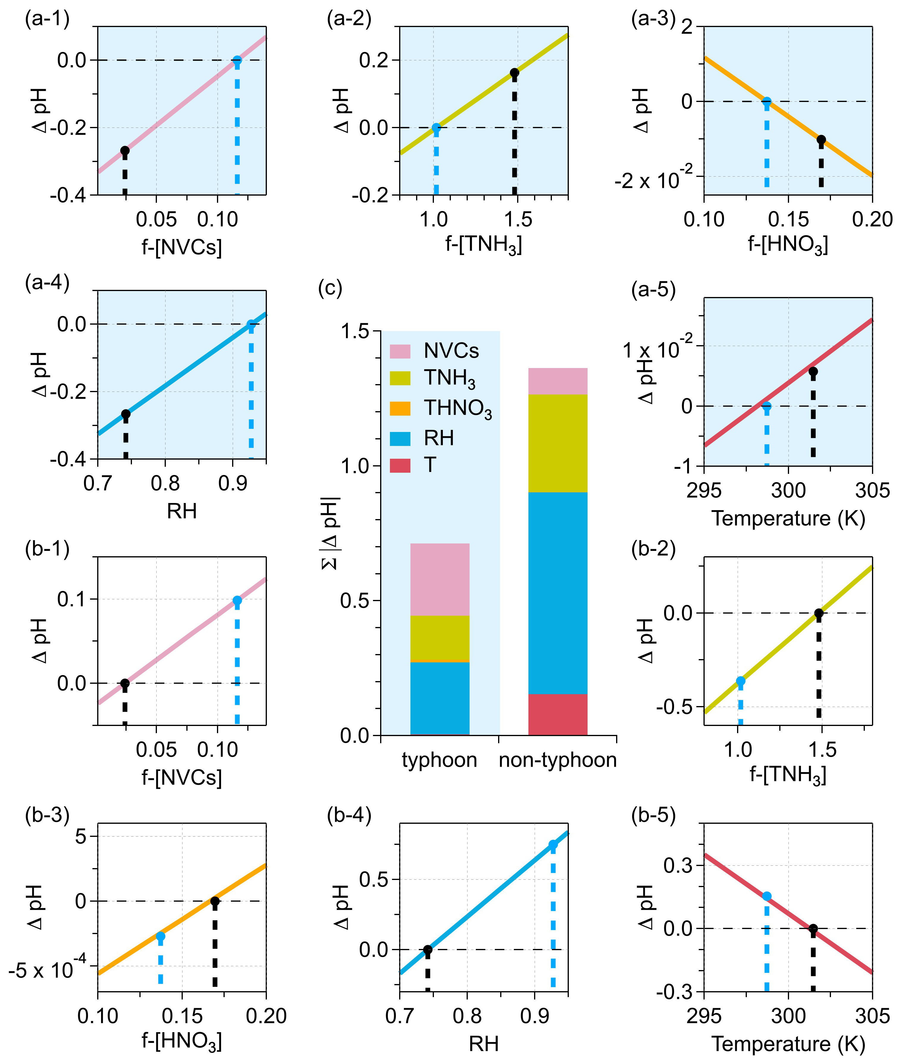 Figure 3Aerosol pH differences (ΔpH) between typhoon (a-1–a-5) and non-typhoon (b-1–b-5) scenarios, attributed to anion-normalized non-volatile cations (NVCs) and total ammonia (TNH3), the fraction of total nitric acid (THNO3) in anions, relative humidity (RH), and temperature (T). The light blue background indicates simulations using typhoon conditions as inputs (a-1–a-5), whereas the white background denotes simulations with non-typhoon conditions (b-1–b-5). Panel (c) summarizes the total absolute ΔpH () of different drivers in both scenarios. The blue and black dashed lines represent the corresponding values for typhoon and non-typhoon scenarios, respectively.