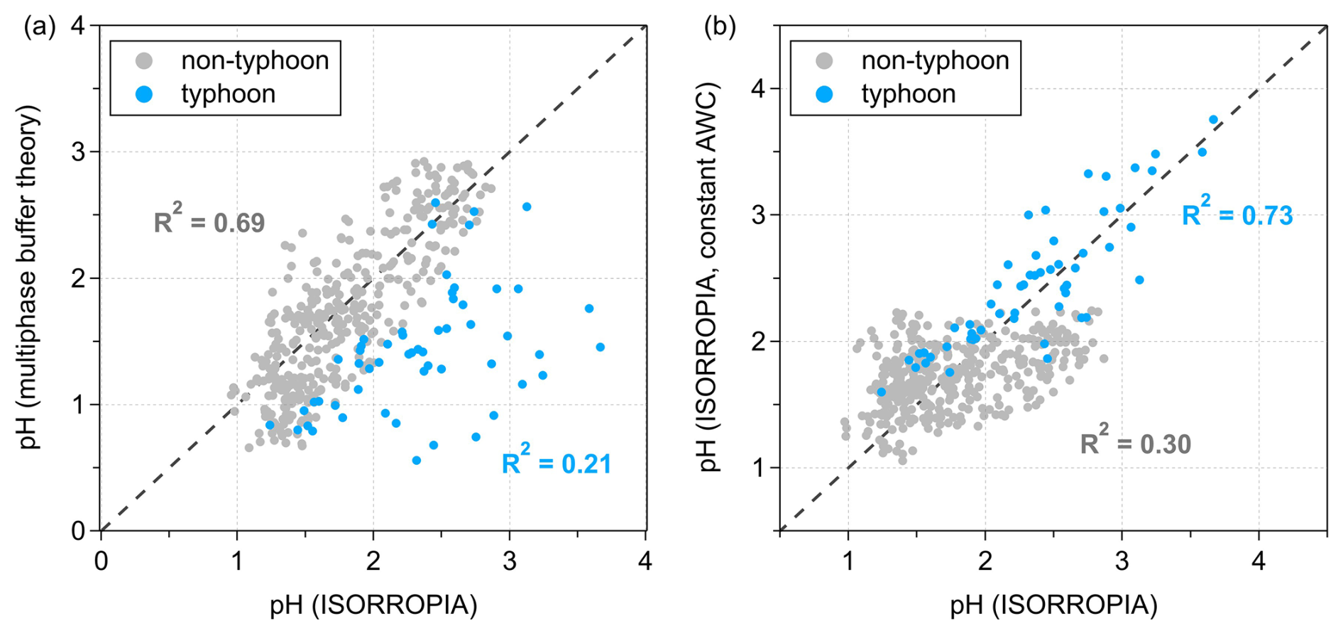 Figure 4Correlations between aerosol pH simulated using ISORROPIA and pH predicted by (a) the multiphase buffer theory, and (b) ISORROPIA under a constant aerosol water content (AWC) assumption with varying chemical compositions. Blue and gray dots represent typhoon and non-typhoon scenarios, respectively. The black dashed line indicates the 1:1 reference.