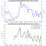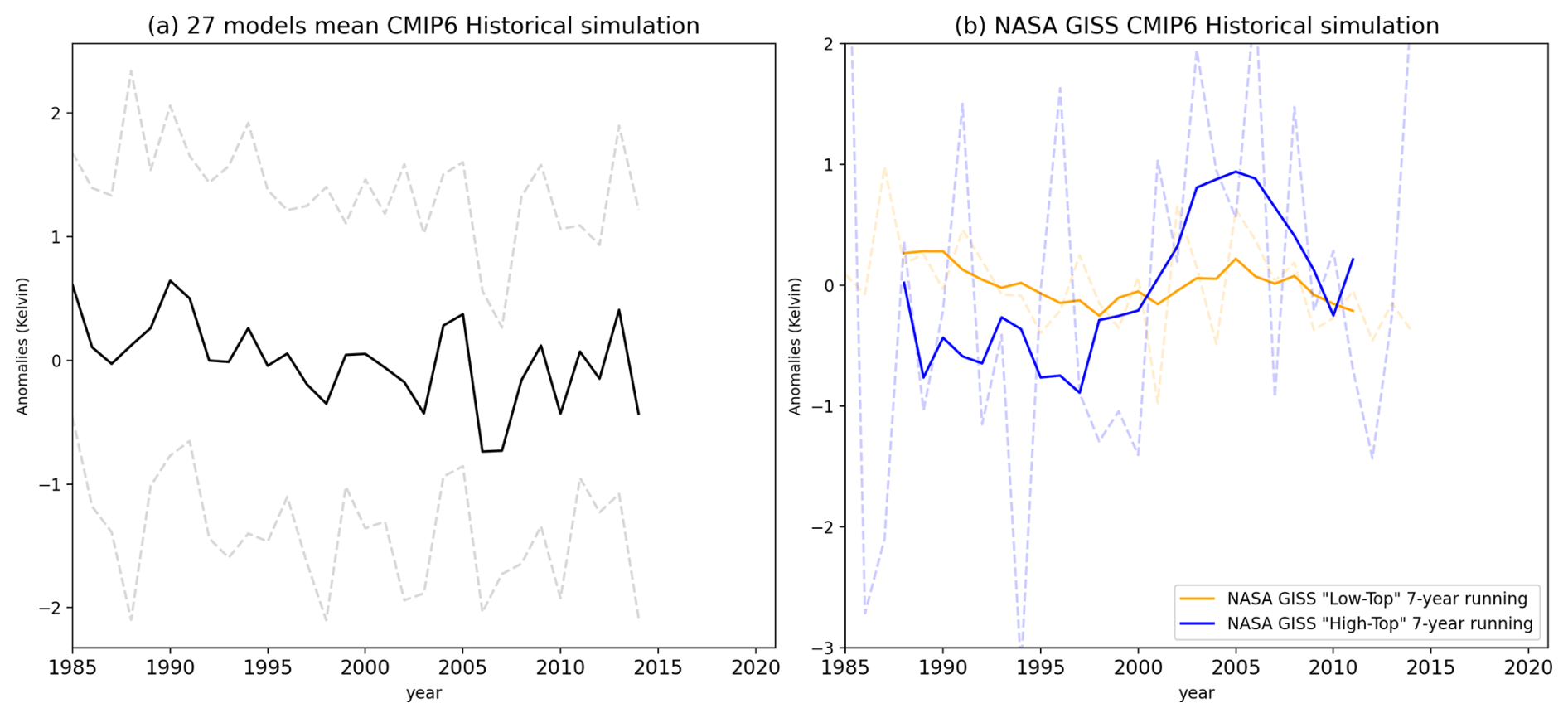 Figure 9NH DJF mean 150–10 hPa and 65–90° N mean air temperature for (a) CMIP6 27 models mean Historical simulation (bold black line), and 1 std model spread are in dotted grey line. (b) shows NASA GISS “Low Top” (orange) & “High Top” (blue) simulation 7-year running mean, and actual anomalies are in dotted lines.
