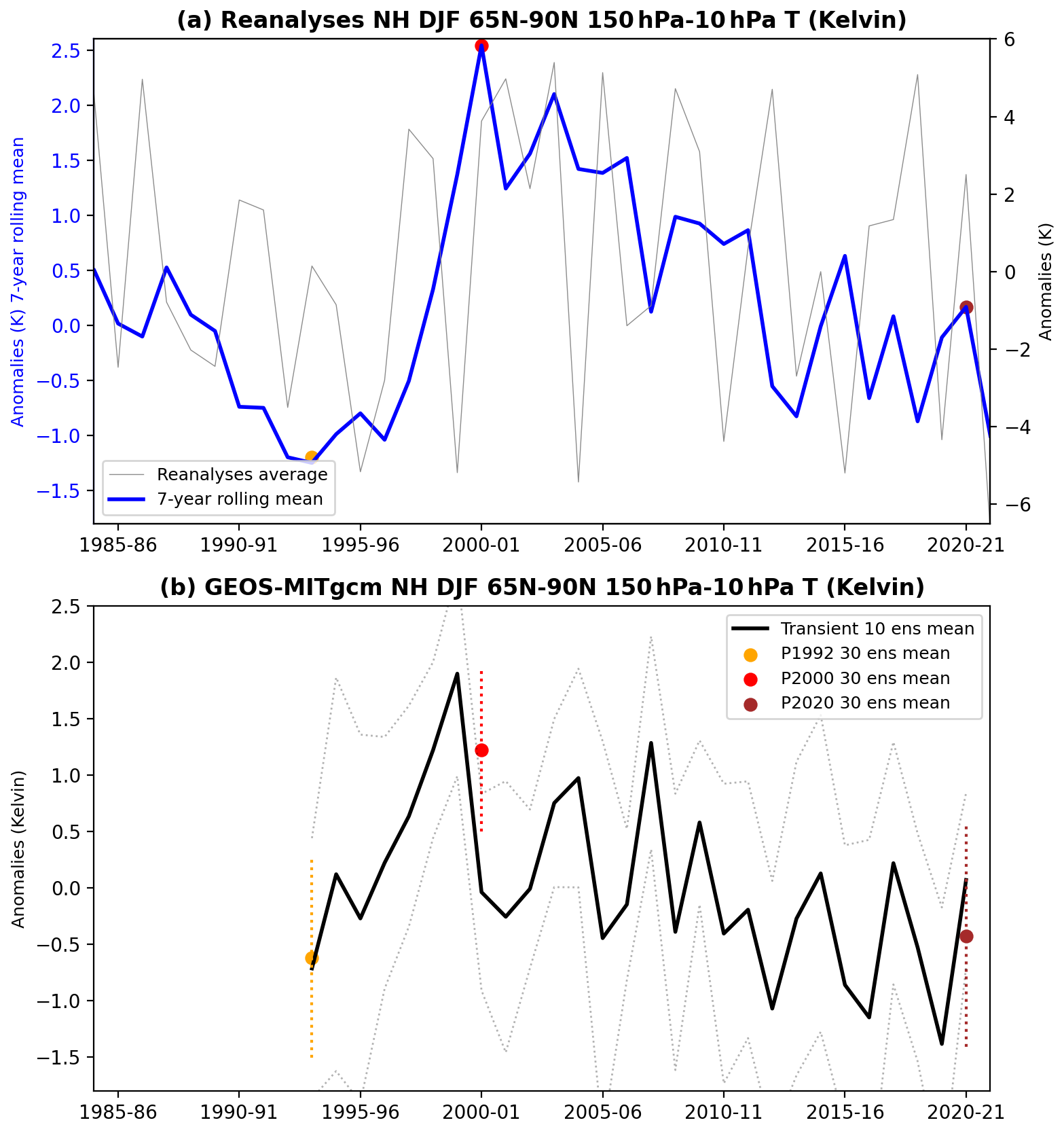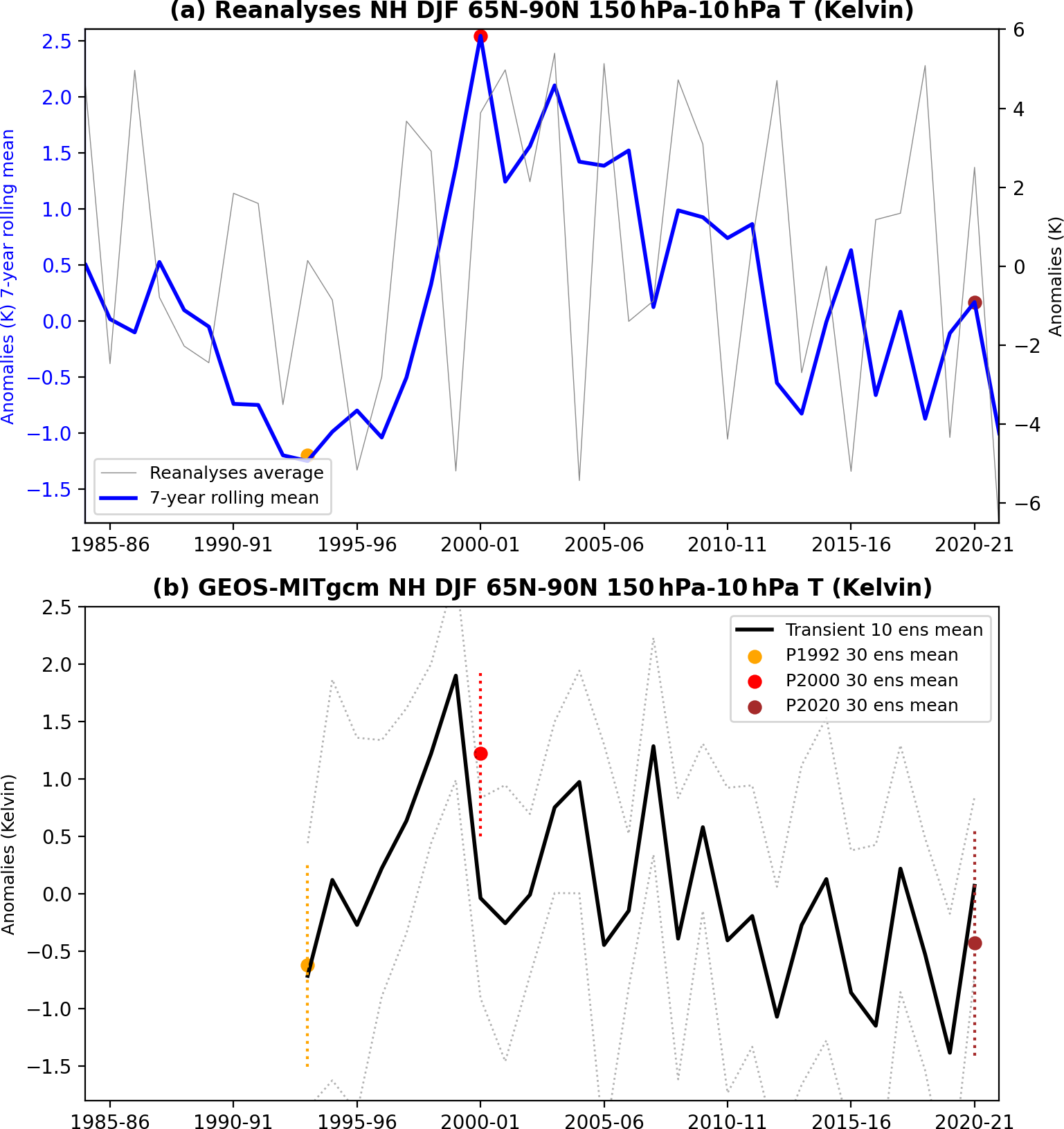 Figure 1NH DJF mean 150–10 hPa and 65–90° N mean air temperature anomalies for (a) Reanalysis (MERRA2 and ERA-5), and (b) GEOS-MITgcm. The DJF mean is shown in thin black line and its 7-year running mean in blue in the panel (a). The GEOS-MITgcm 10-member mean transient simulation shown in (b) with bold black line with 1-std spread (grey dotted lines). The 30-member ensemble mean of perpetual experiments is shown in (b) for P1992 (orange line), P2000 (red line), and P2020 (brown line). The 1-std spread of the ensemble is shown with dotted lines. Anomalies are based on 1982–2020 for reanalysis and 1992–2020 for GEOS-MITgcm.