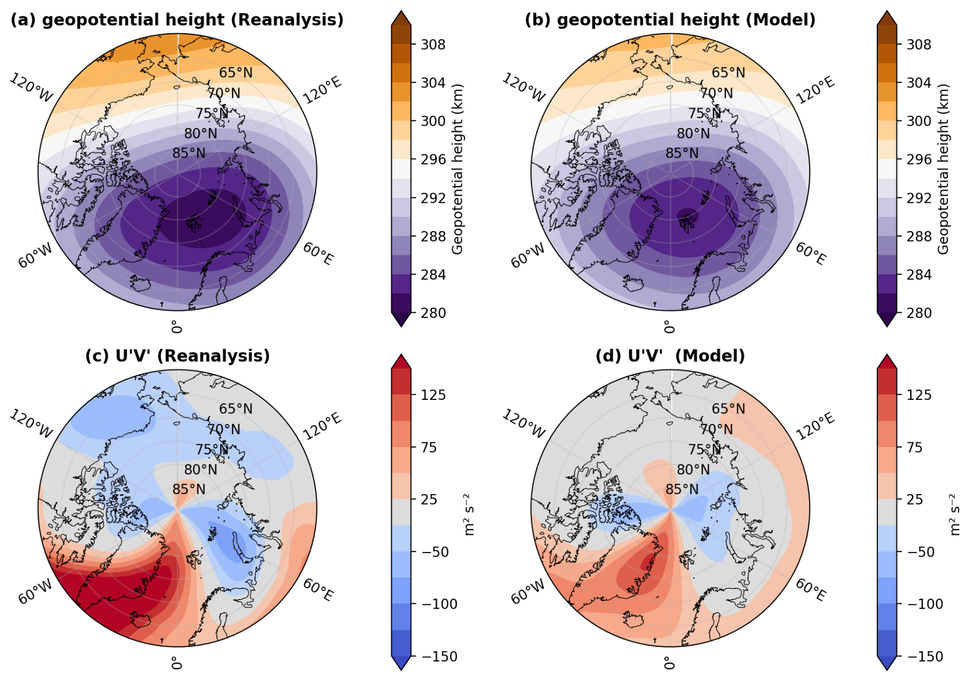 Figure 2The mean state and variability of the polar vortex during January at 10 hPa are shown by the monthly mean geopotential height (km) and momentum flux (m2/s2) (, calculated from sub-monthly fields) for the MERRA-2 reanalysis (1992–2020) in panels (a) and (c), and for the GEOS-MITgcm 10-member ensemble mean (1992–2020) in panels (b) and (d). The model reproduces a mean state and stability similar to those in the reanalysis.