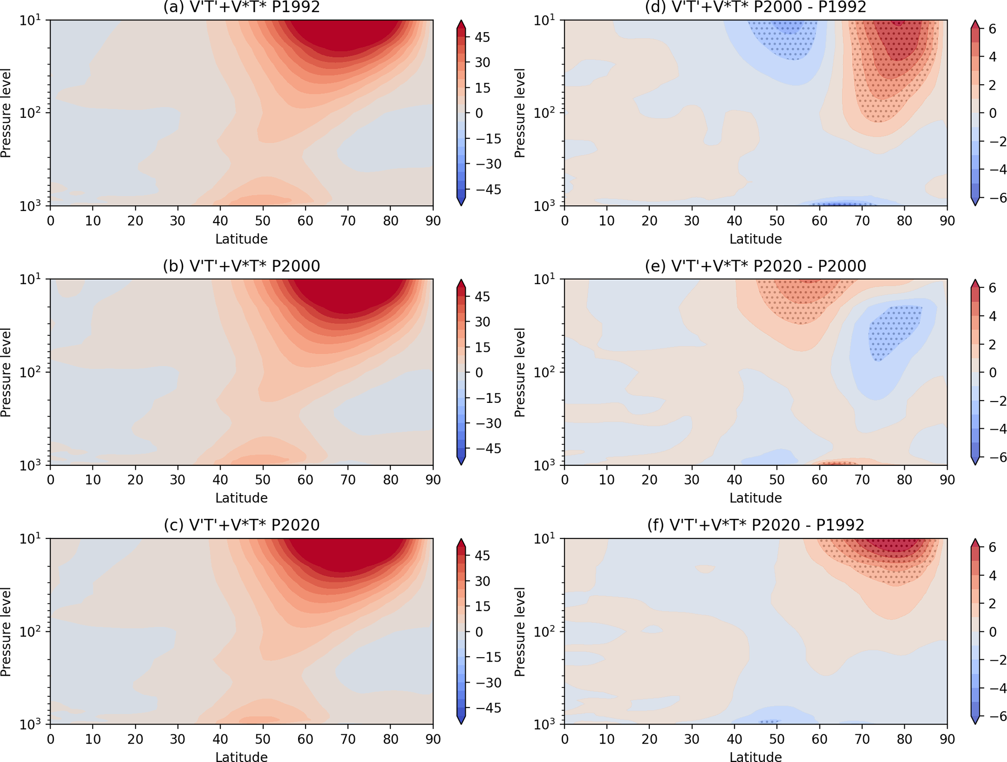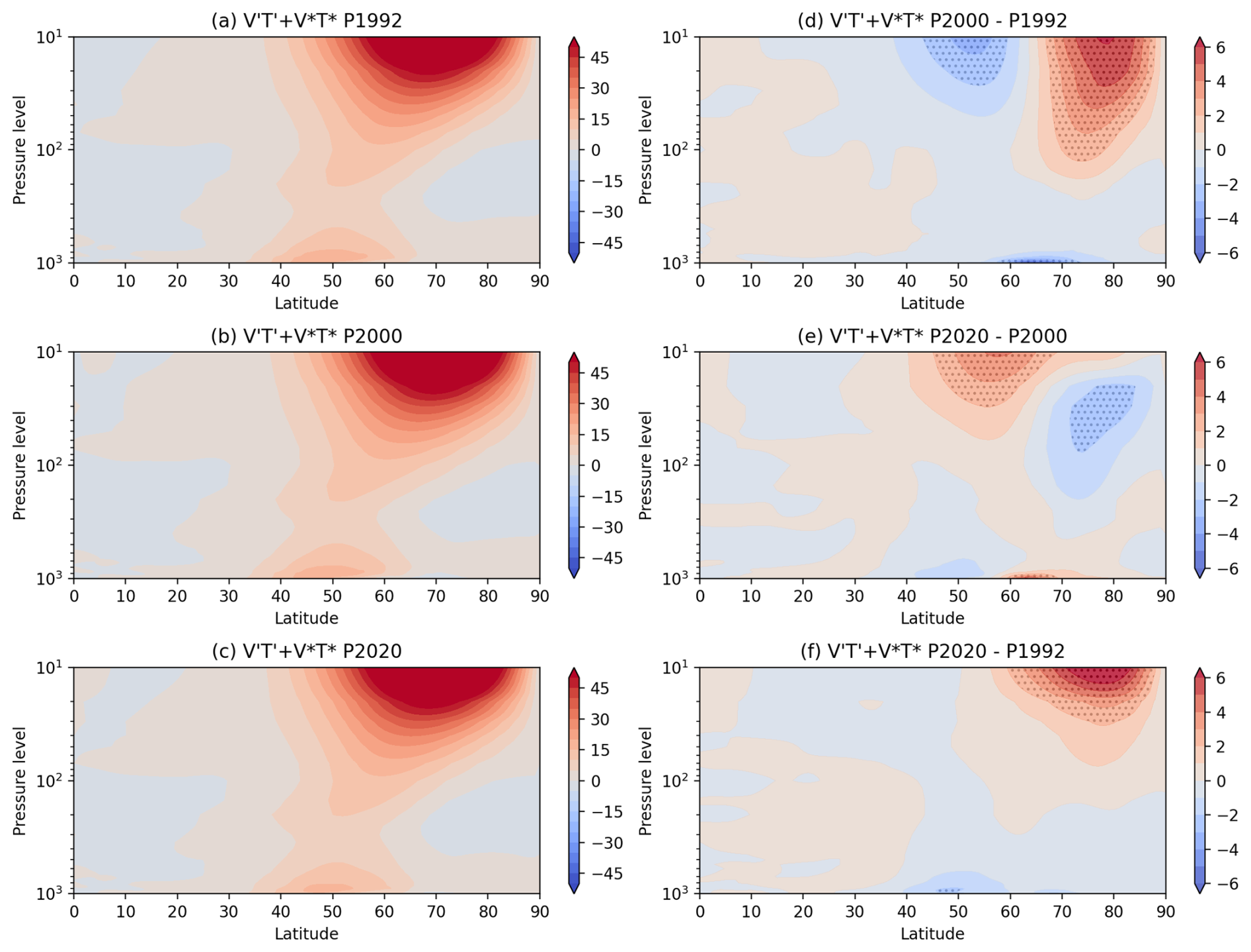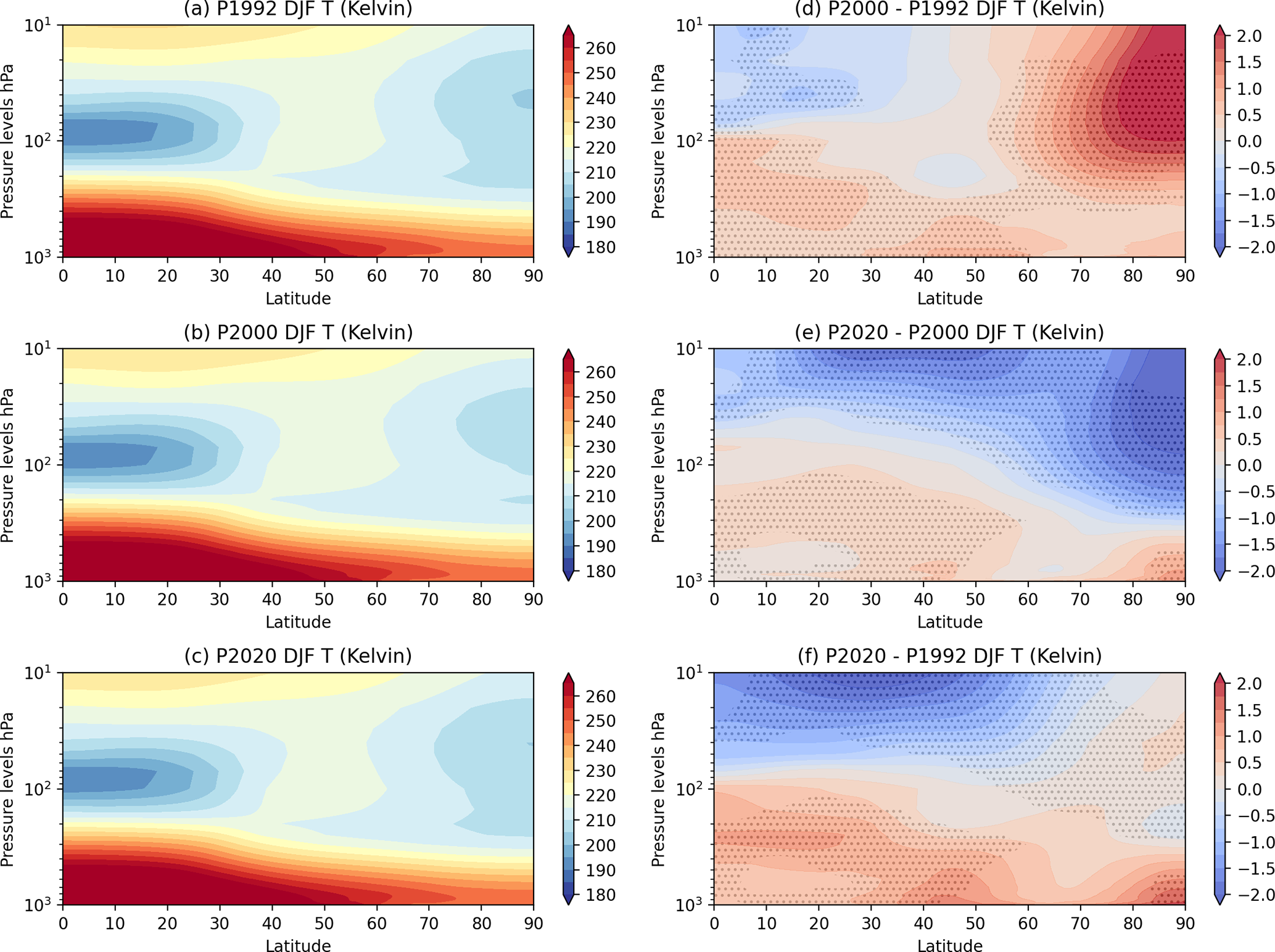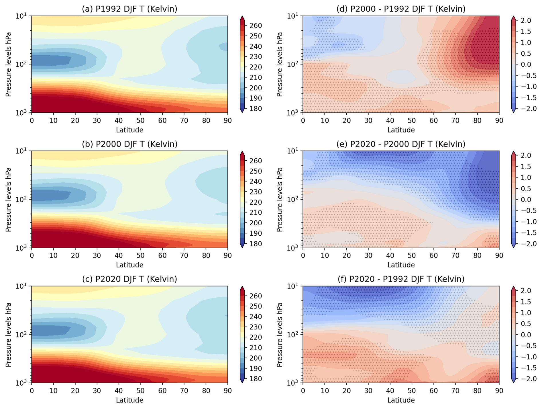 Figure 3Zonal Mean NH DJF air temperature (T) mean for (a) P1992, (b) P2000, (c) P2020, and (d) difference between P2000–P1992, (e) difference between P2020–P2000, (f) difference between P2020–P1992; (unit: Kelvin). Figures are stippled at 95 % significance computed using a difference of means 2-sided t-test from the 30-member ensemble sample.