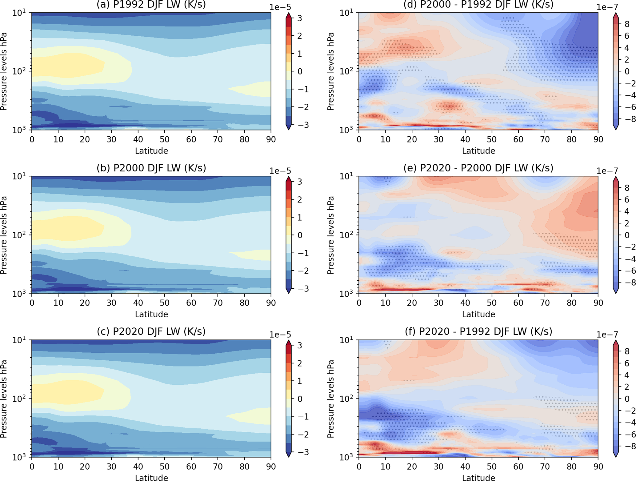 Figure 4Zonal Mean NH DJF Longwave Cooling mean for (a) P1992, (b) P2000, (c) P2020, and (d) difference between P2000–P1992, (e) difference between P2020–P2000, (f) difference between P2020–P1992. Figures are stippled at 95 % significance computed using a difference of means 2-sided t-test from 30-member ensemble sample.