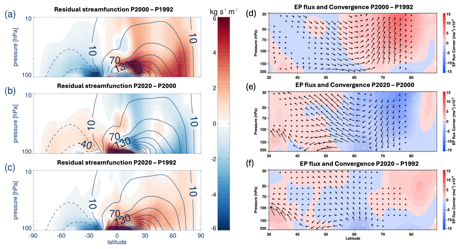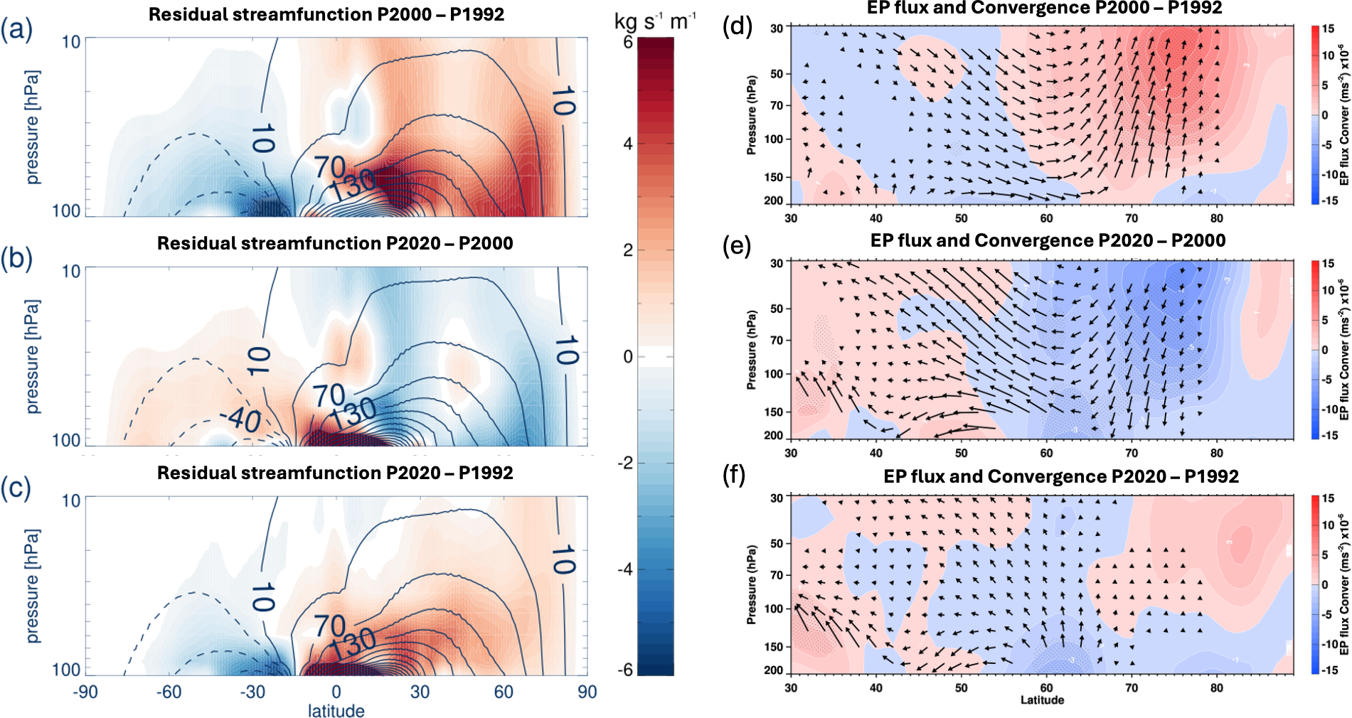 The stratospheric residual circulation is driven by momentum deposition from Rossby wave breaking interacting with the zonal flow in the midlatitudes (Andrews et al., 1987). This is quantified by the EP flux convergence, wherein positive convergence decelerates the zonal mean zonal wind and induces subsidence over high latitudes. Figure 6d, e, f shows the changes in the EP flux and its convergence between P2000–P1992, P2020–P2000, and P1992–P2000. The upward-pointing arrows and the increase in convergence at midlatitudes in panel (d) indicate an intensification of wave activity and wave breaking between 1992 and 2000. This is consistent with the strengthening of the residual circulation during that period (Fig. 6a) and, consequently, with the increase in polar temperature. The converse is true for the changes between 2000 and 2020. The overall change between 1992 and 2020 (panel f) is also consistent with the intensification of the residual circulation over the same period (Fig. 6c).