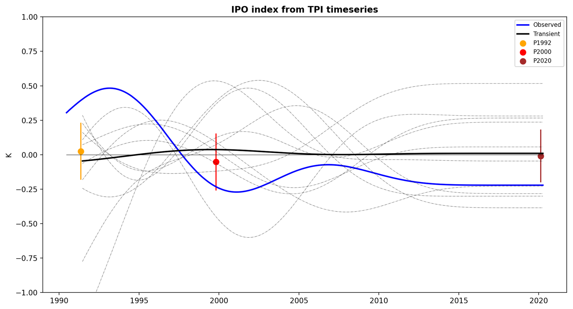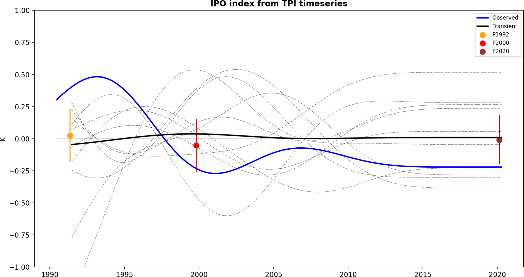Figure 7Tripole Index (TPI) for the Interdecadal Pacific Oscillation (IPO) timeseries is shown for observed data (blue line, NOAA OI SST V2) and model simulations. The black line shows the 10-member ensemble mean, while dotted lines show individual simulations. Perpetual experiments are shown with their 1-std spread for P1992 (orange), P2000 (red), and P2020 (brown). Anomalies are calculated based on the 1992–2020 baseline year.