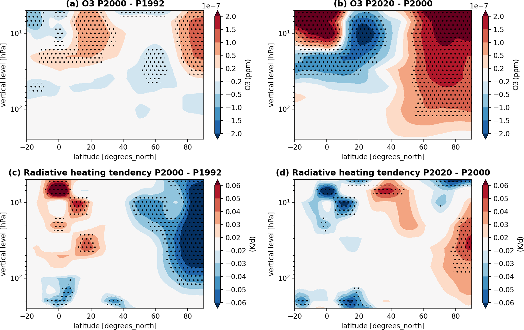 Figure 8Zonal mean DJF (a, b) Ozone (ppm), and (c, d) radiative heating tendency (K d−1) are shown for the (a, c) P2000–P1992, and (b, d) P2020–P2000 (95 % significant differences are shown for 30-member ensemble).