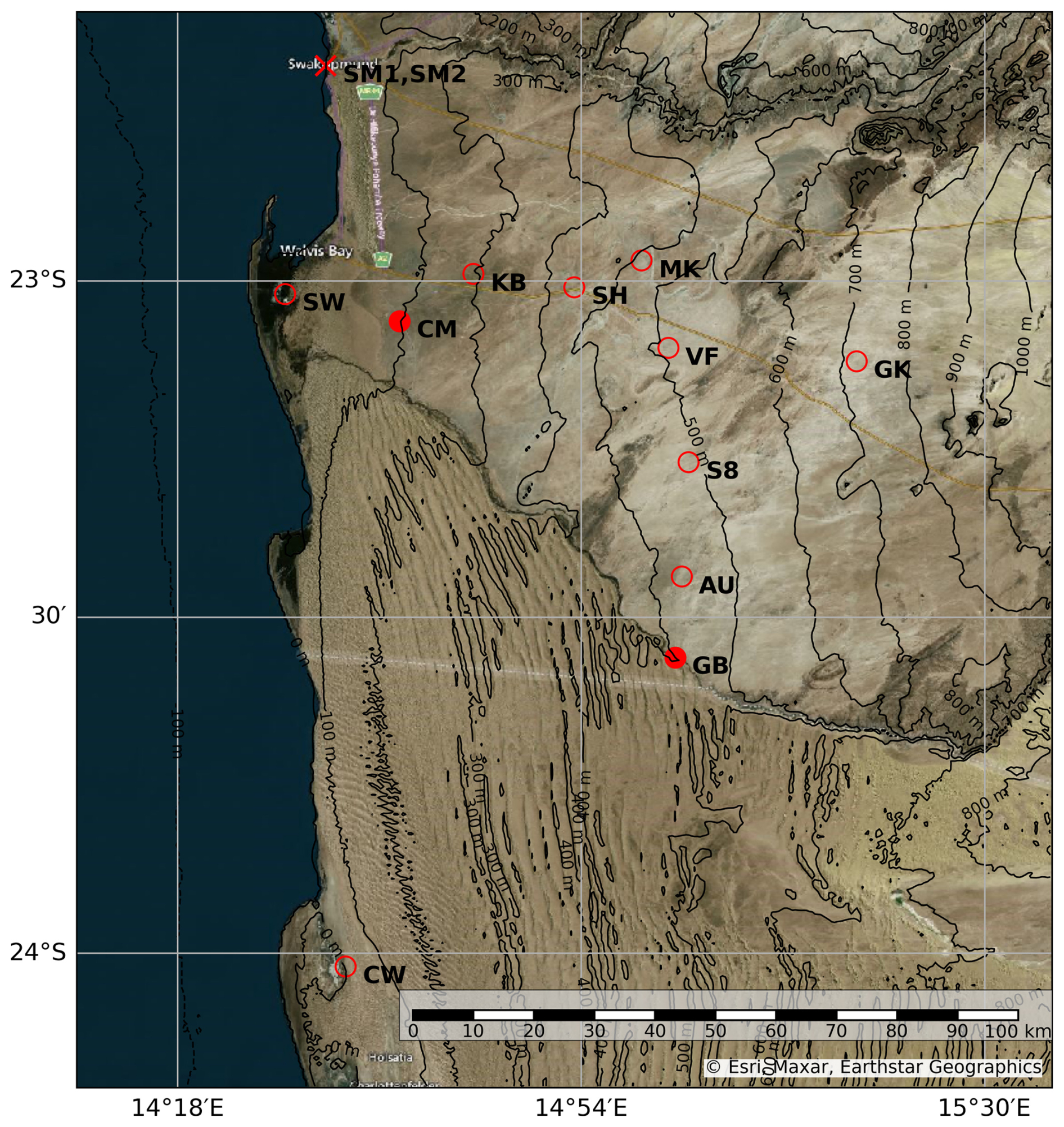 Figure 1Map showing the research area in the central Namib and the spatial distribution of the FogNet stations described in Table 2. The stations marked with filled red dots (GB:Gobabeb and CM:Coastal Met) and at Swakopmund (SM1 and SM2, marked as ×, not a part of FogNet) are equipped with ceilometers, providing continuous CBH observations.