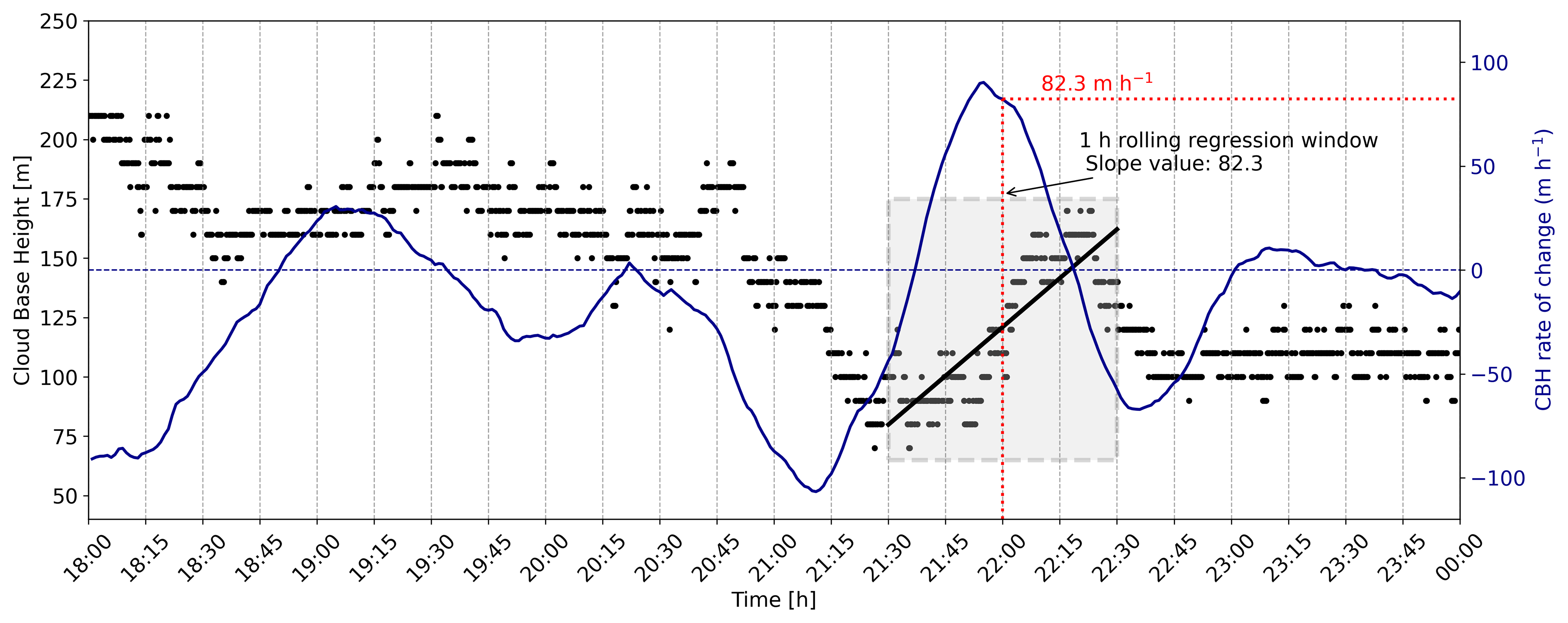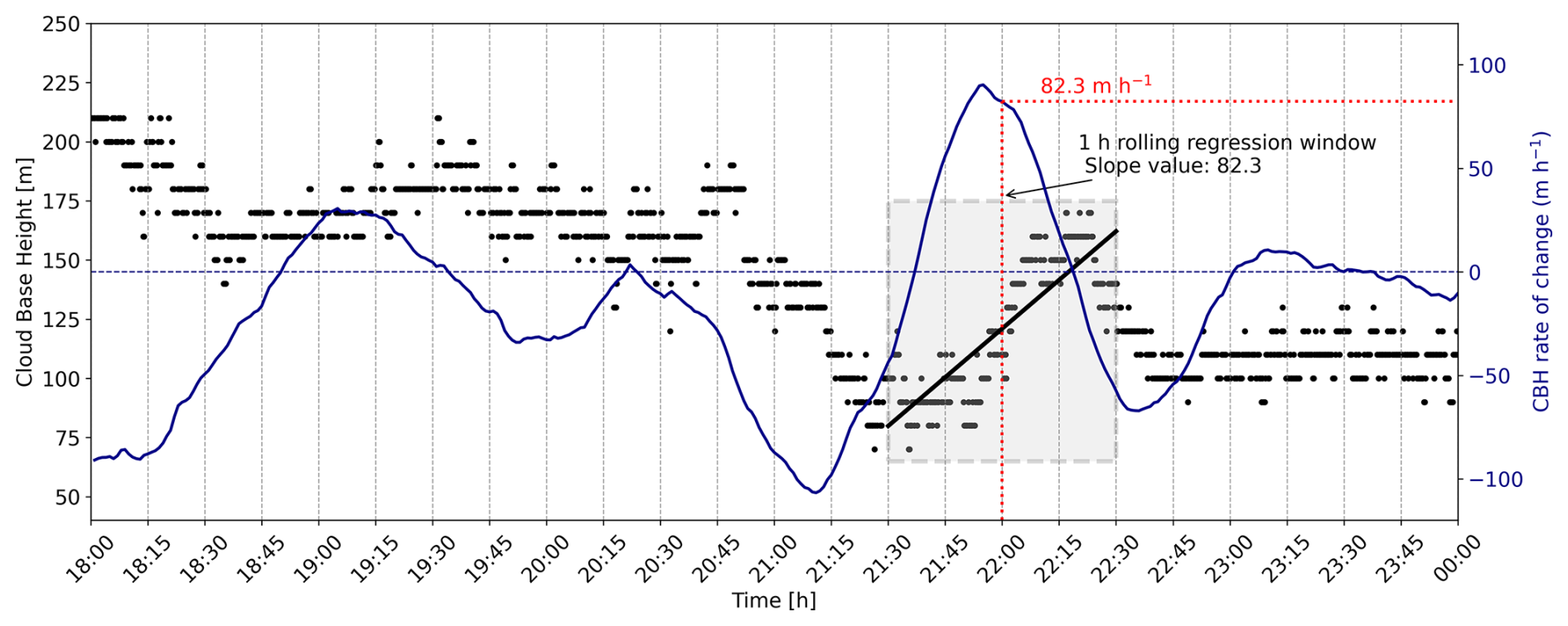 Figure 3Illustration of the 1 h rolling regression method applied to 1 min resolution CBH data. Black dots denote individual CBH measurements; the blue line shows the computed CBH rate of change (m h−1). The shaded region indicates the 1 h regression window centered around the 22:00 timestep. The slope of the fitted black line within this window corresponds to the rate of CBH change at 22:00.