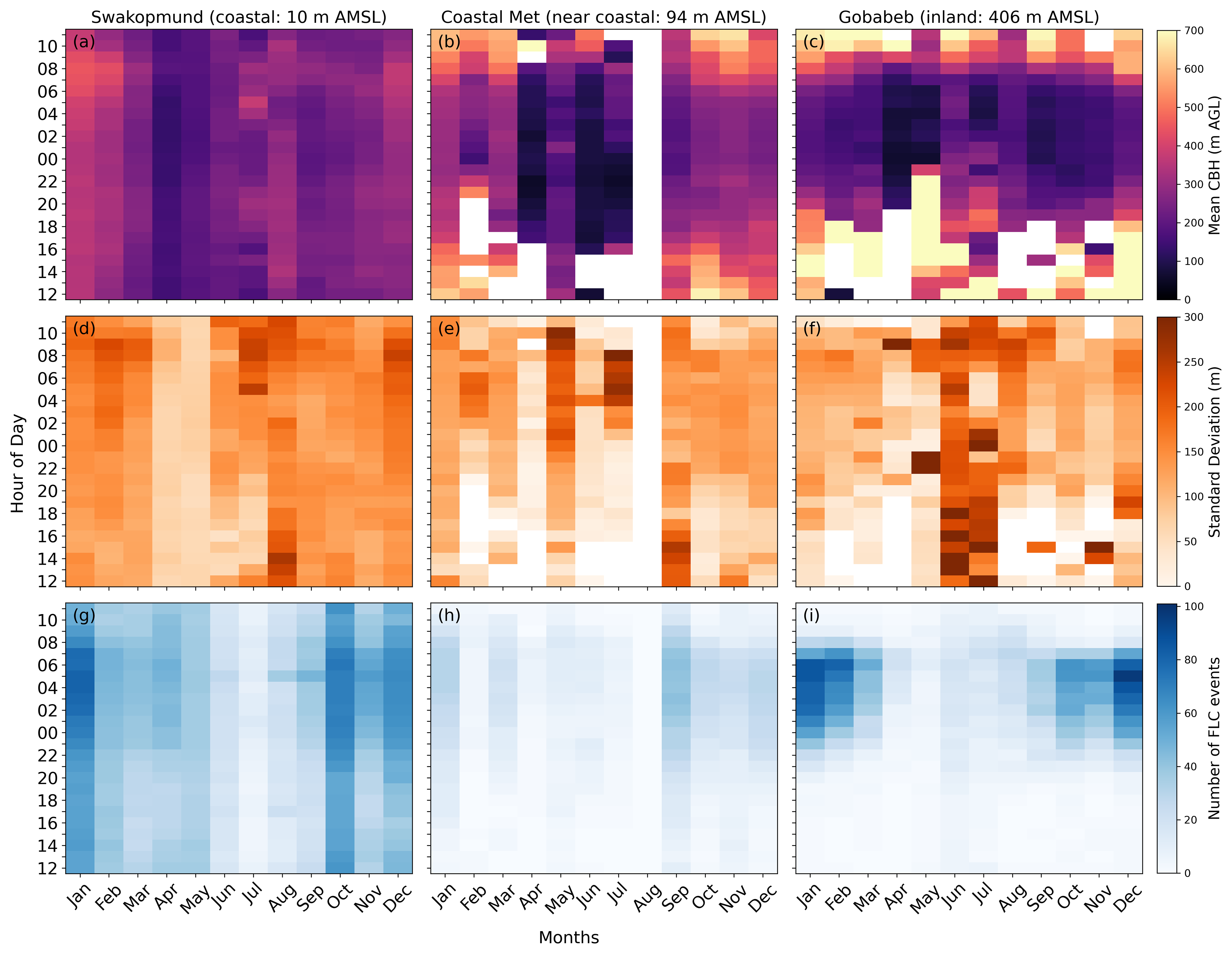 Figure 4Diurnal and seasonal variations in CBH statistics at Swakopmund (left column), Coastal Met (middle column), and Gobabeb (right column).The first row (a–c) shows the mean CBH above ground level, the second row (d–f) presents the standard deviation of mean CBH, and the third row (g–i) indicates the number of FLC events on which the statistics are based. The x-axis denotes the months of the year, while the y-axis corresponds to the time (hour of the day, UTC).