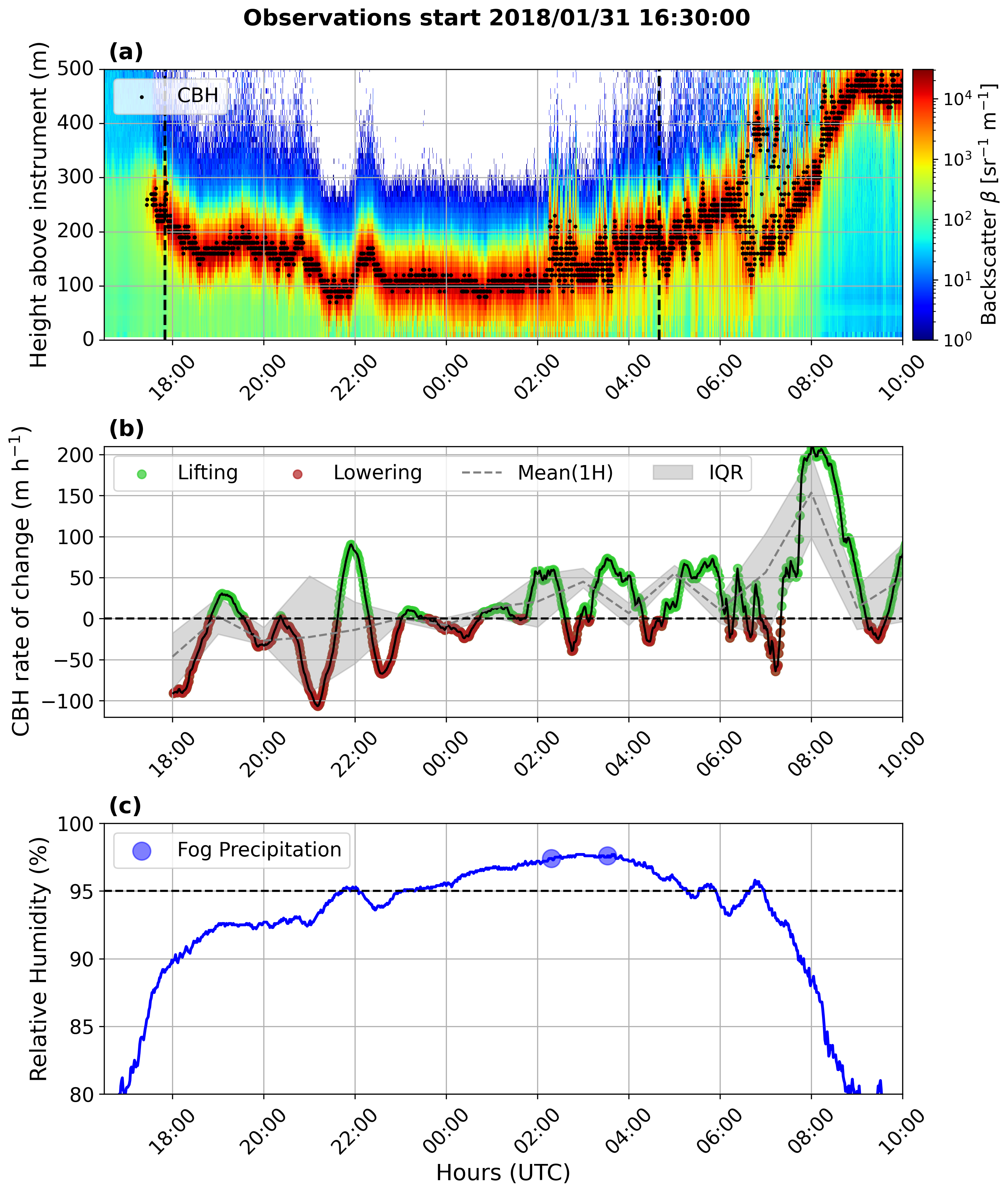 Figure 5Time series analysis of the fog life cycle at the Coastal Met station on 31 January 2018. (a) Backscatter intensity (sr−1 m−1) with CBH markers, illustrating fog evolution. Dashed lines indicate the times of sunrise and sunset. (b) CBH rates of change (m h−1) with lifting (green) and lowering (red), alongside the hourly mean (dashed) and interquartile range (shaded). (c) RH (%) with fog precipitation indicated by blue markers. The figure captures key phases of fog occurrence, development, and dissipation.