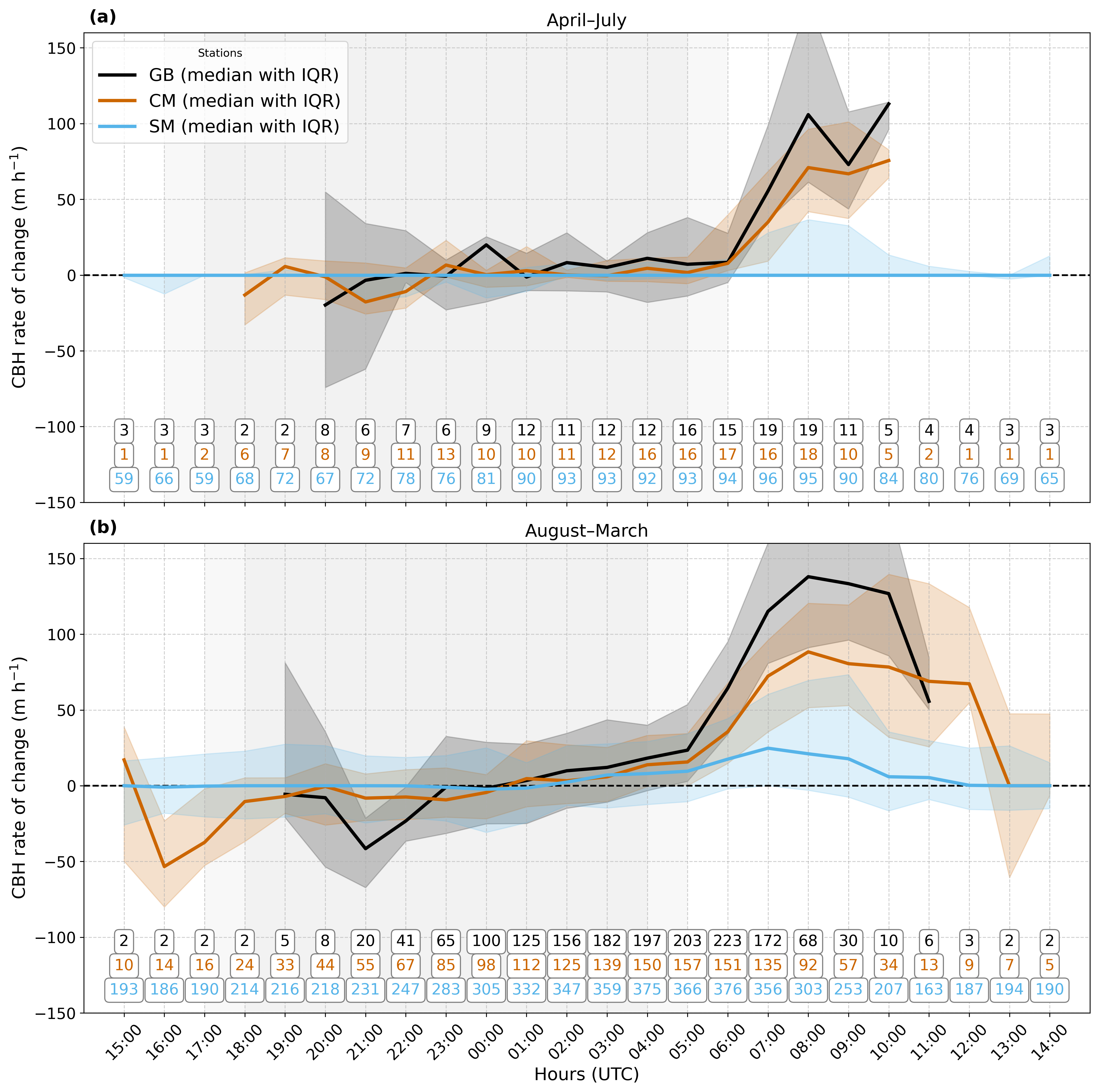 Figure 6Hourly variation in the CBH rate of change (m h−1) for three stations (GB, CM, SM) during (a) the Low-FLC season (April–July) and (b) the High-FLC season (August–March). Solid lines indicate the median, while shaded regions represent the interquartile range (IQR). Positive values correspond to CBH lifting, whereas negative values indicate lowering. Sample sizes for each station and hour are indicated by numbers; however, the CBH rate of change is only displayed for hours with a sample size greater than five.
