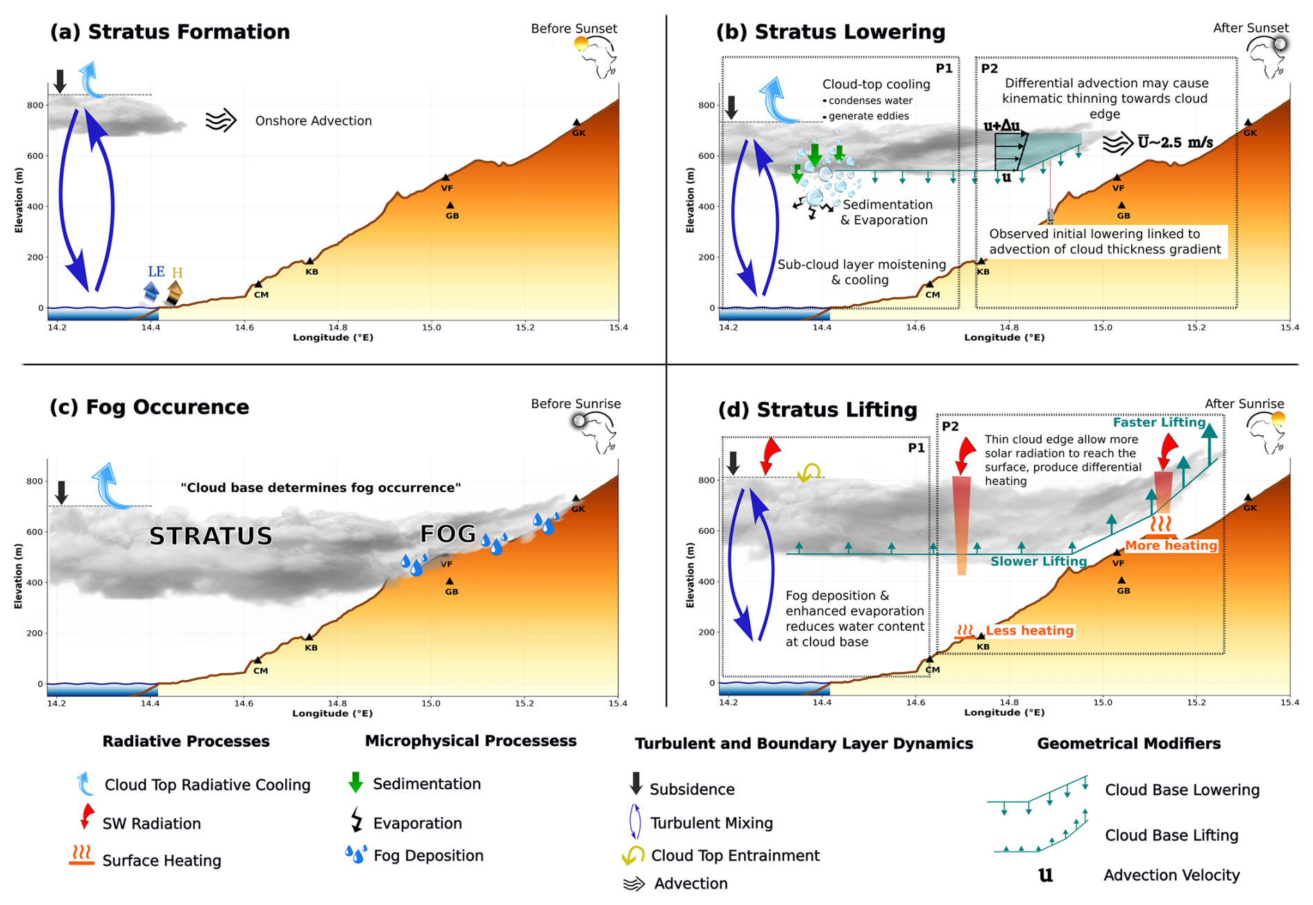 To date, no study has specifically observed stratus base lowering and lifting in the Namib or examined the processes governing them. However, research from other regions provides important insights. The diurnal evolution of stratus base in our study can be understood as the outcome of multiple interacting mechanisms. These include microphysical and radiative controls, turbulent and boundary-layer dynamics, and, as we propose here, additional modifiers linked to cloud geometry. While the first two categories are well established in the fog literature, the latter represents interpretations emerging from our observations in the Namib. The schematic in Fig. 7 summarizes dominant processes for different stages in the fog life cycle. In Fig. 7b, d, these established processes (P1) are shown alongside our proposed modifiers (P2), together illustrating the mechanisms of cloud base lowering and lifting throughout the fog life cycle. It is important to note that Fig. 7 represents a simplified conceptualization of stratus onshore advection from the west, though advection from the northwest or north in this region can also occur without altering the relevance of the processes and drivers illustrated.