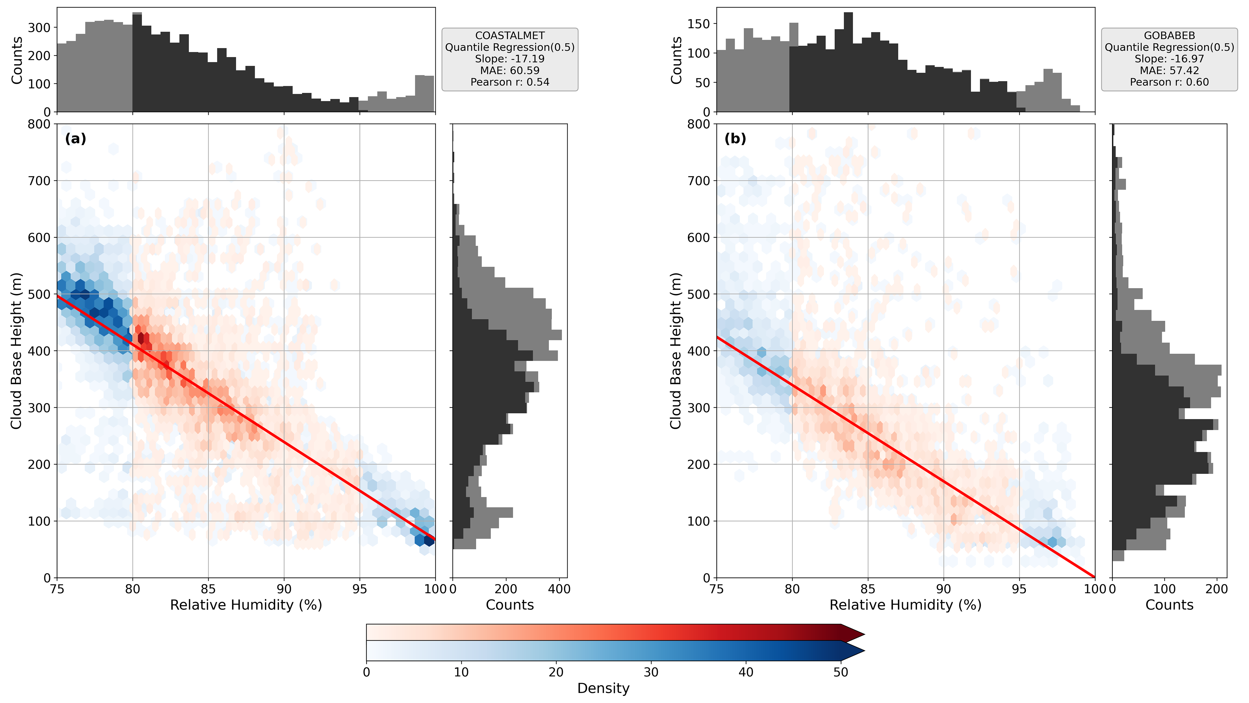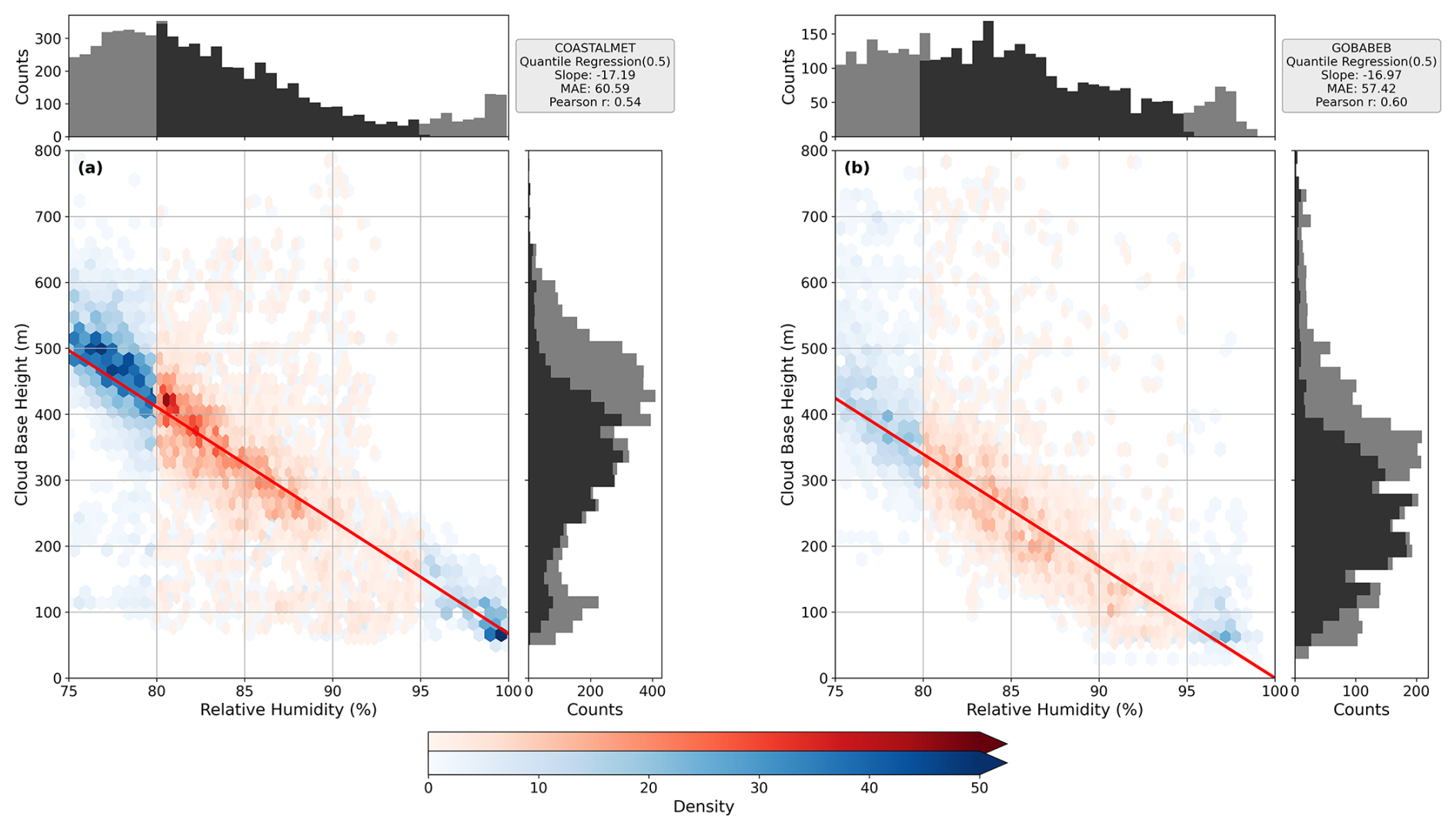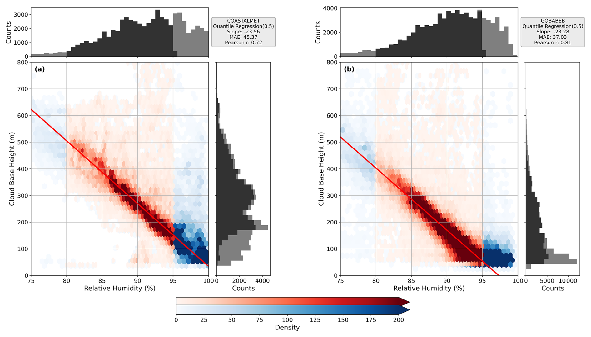 Figure 9Density scatter plots showing the relationship between CBH and RH during the night hours (22:00–07:00) for two stations: (a) Coastal Met and (b) Gobabeb. Red shades highlight the RH range between 80 % and 95 %, which is used for the 0.5 quantile regression fit, shown as a solid red line. Marginal histograms along the top and right axes show the distribution of RH and CBH, respectively, the black shade correspond to data within the 80 % RH–95 % RH range and their associated CBH values.