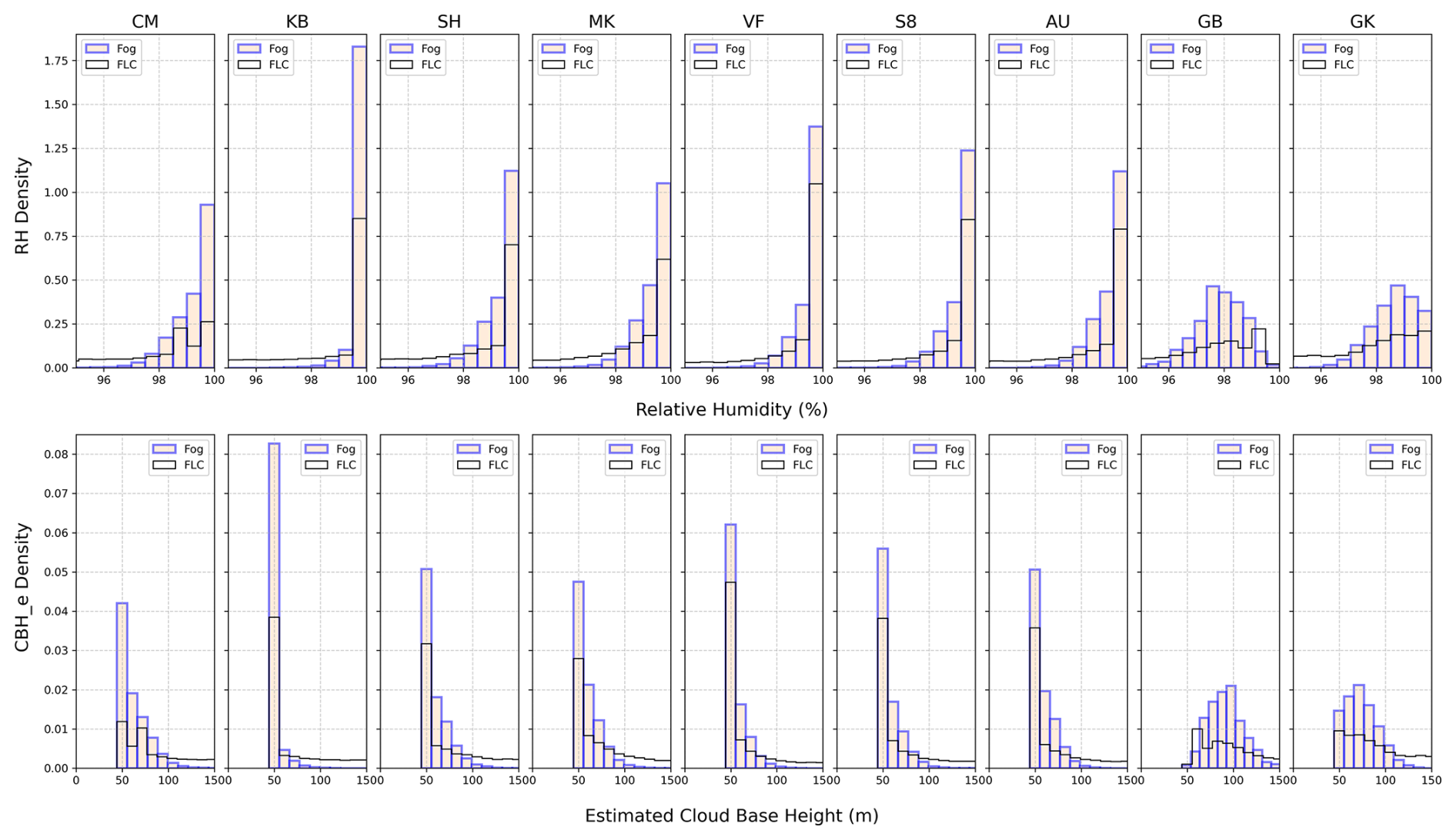 Figure 10Density histograms of RH (upper panel) and (CBHe) (bottom panel) during fog event and satellite derived fog and low cloud (FLC) occurrences across different FogNet stations from 1 July 2014 to 31 December 2023.