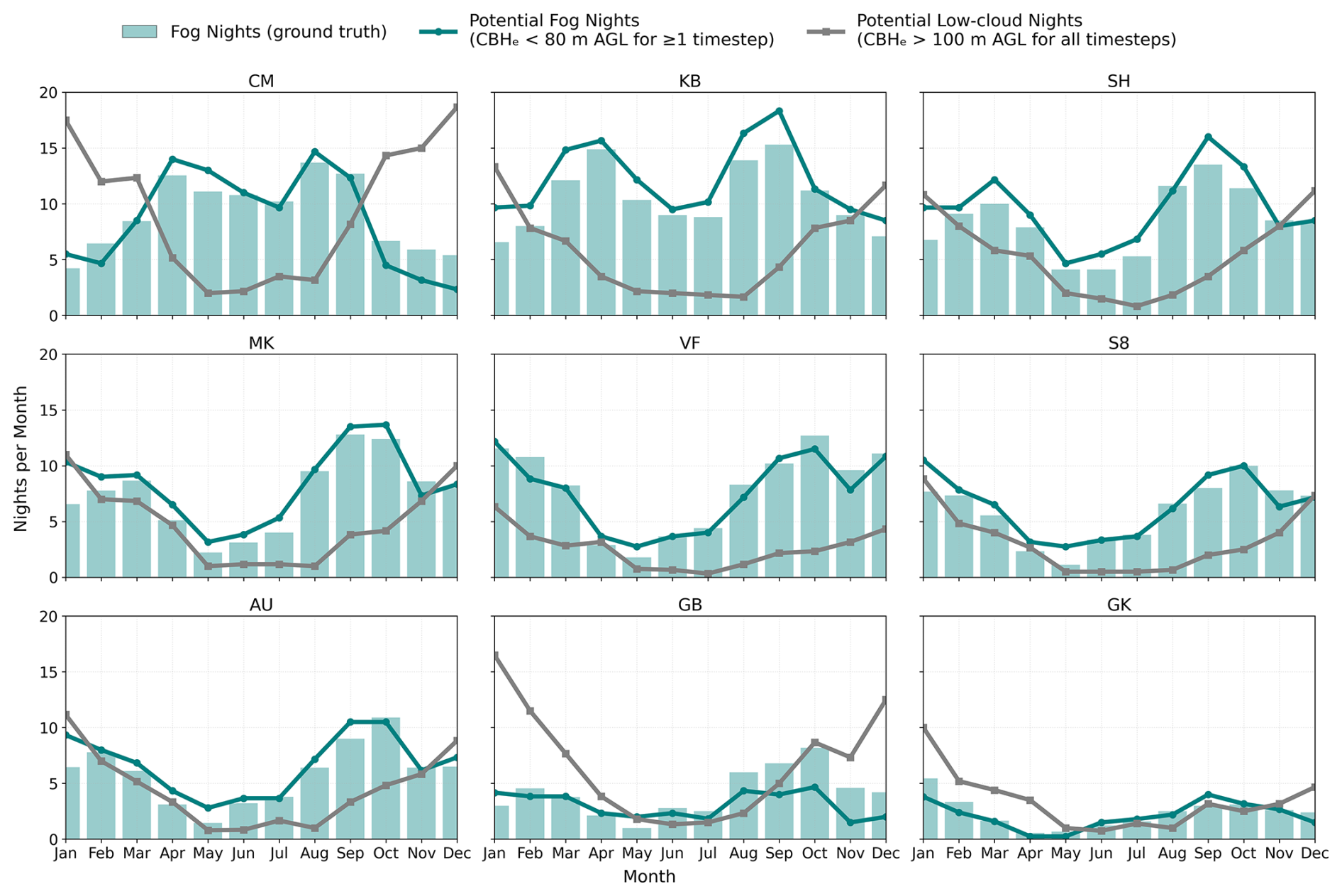 Figure 11Monthly mean number of observed fog nights and potential fog nights at FogNet stations from July 2014 to December 2023. Observed fog nights (ground truth) are shown as green bars. The green line represents potential fog nights derived from FLC retrievals where CBHe < 80 m AGL for at least one timestep during a night, and the grey line represents potential low-cloud nights where CBHe > 100 m AGL for all timesteps of a night.