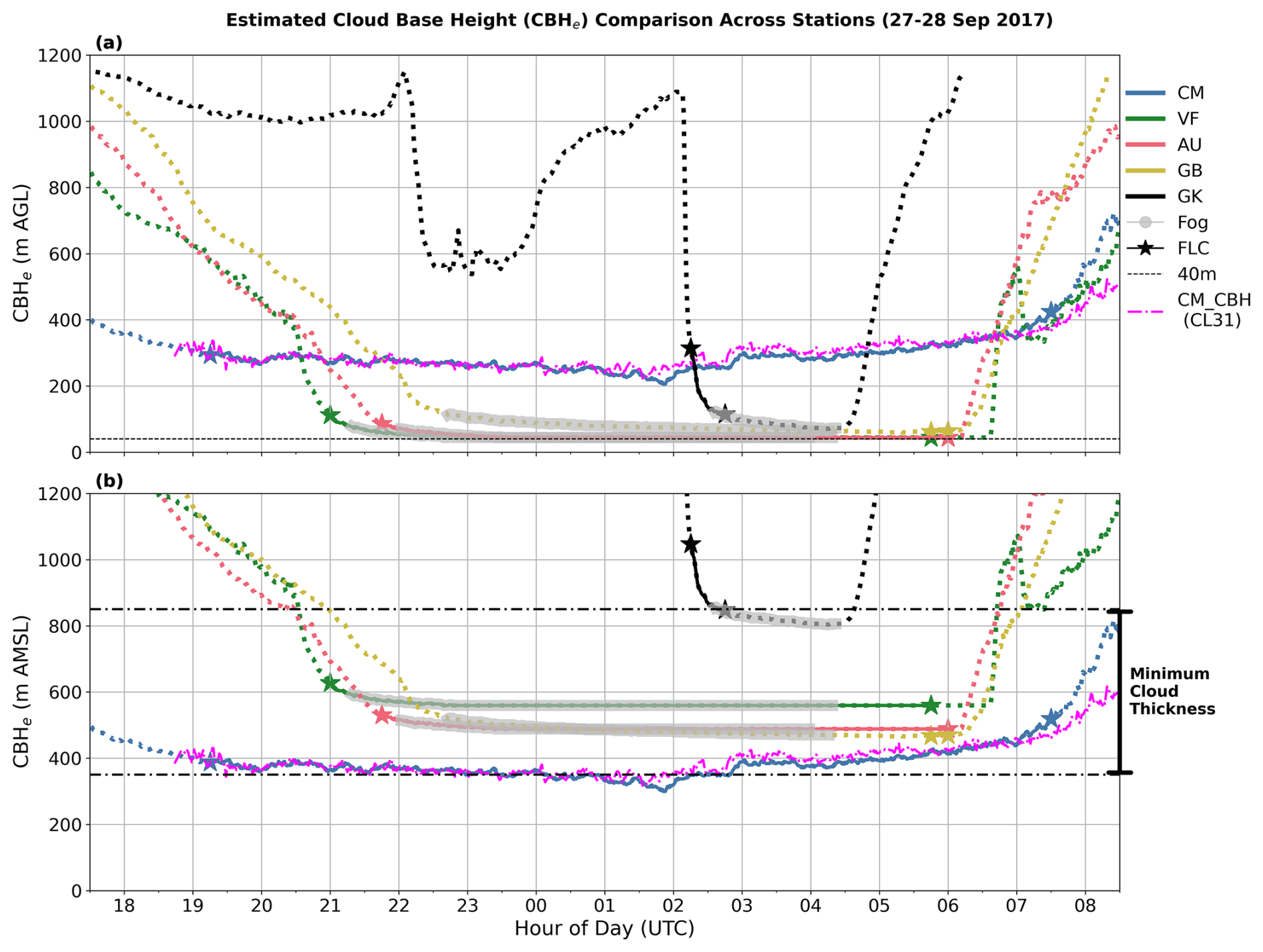 Figure 12CBHe at five selected FogNet stations during a representative fog event on 27–28 September 2017 (stations selected for regional representativeness and figure clarity). Each curve (color-coded) corresponds to one station, with dashed and solid line styles indicating satellite-derived clear-sky and FLC conditions, respectively. Star markers denote the start and end times of satellite-detected FLC, while grey markers indicate ground-observed fog occurrences. The vertical bar in (b) illustrates the potential cloud thickness during the event.