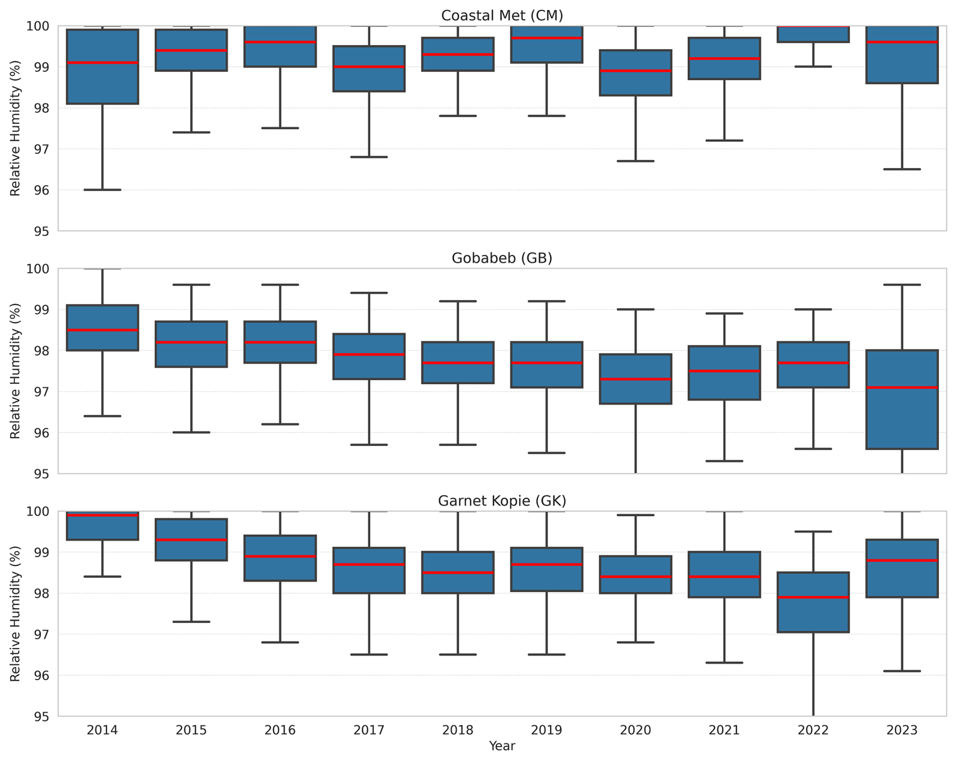 Figure A1Yearly distribution of Relative Humidity (RH) during fog events at Coastal Met (top), Gobabeb (middle) and Garnet Kopie (bottom) from 2014 to 2023. Boxplots represent the inter-quartile range (IQR), with whiskers extending to 1.5× IQR, and red lines indicating the median.