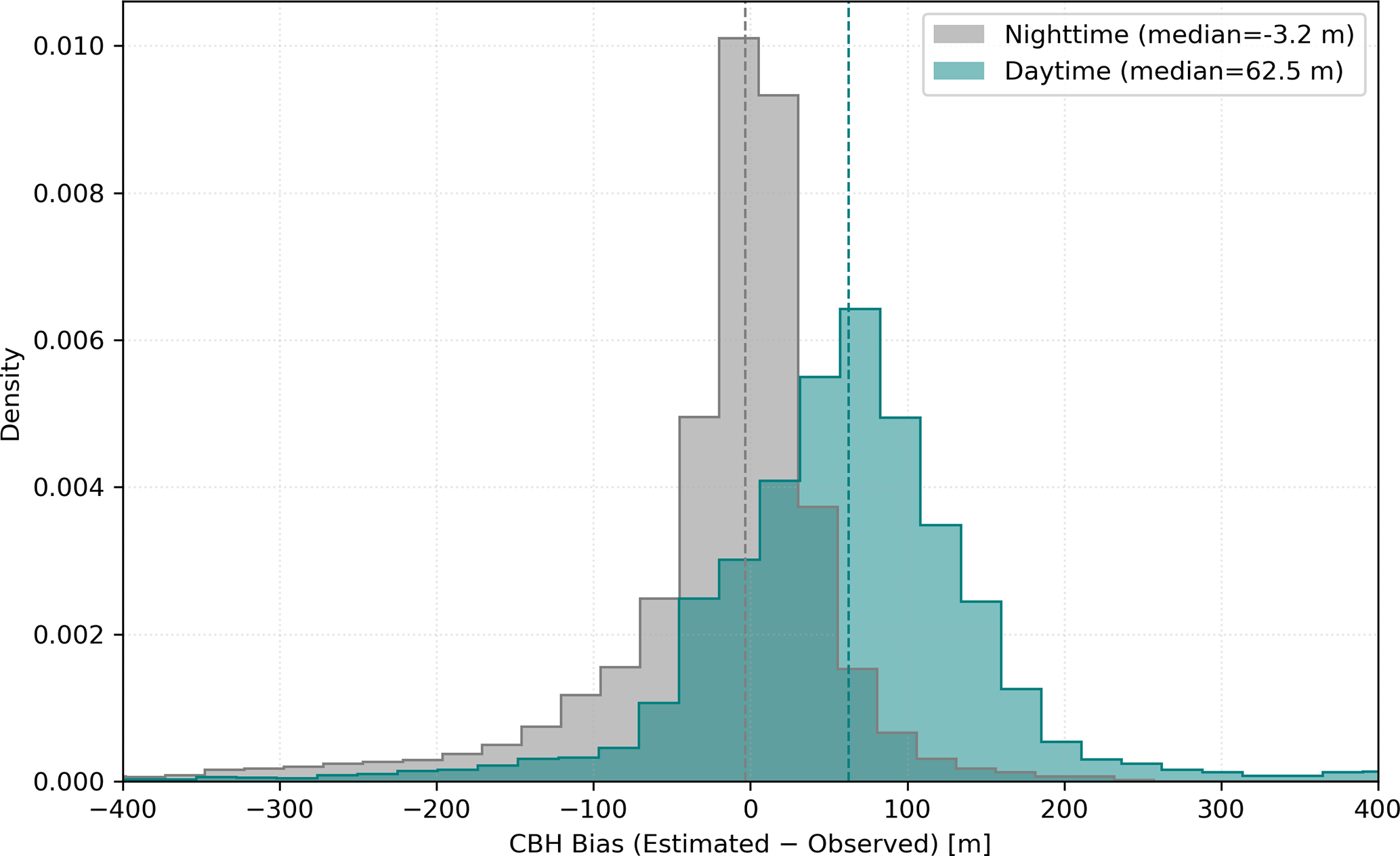 Figure A3Distribution of CBH bias (estimated minus observed) during nighttime (22:00–07:00 UTC, grey) and daytime (07:00–11:00 UTC, teal green) periods for Coastal Met. The nighttime distribution is centered near zero (median = −3.2 m), indicating good agreement between estimated and observed CBH during nocturnal well mixed boundary layer conditions. In contrast, the daytime distribution shows a rightward shift (median = 62.5 m), reflecting a positive bias in estimated CBHe. This shift can be attributed to the transient decoupling between the surface-heated convective layer and the cloud–subcloud layer aloft that remains mixed primarily by cloud-top radiative cooling after sunrise.