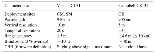 Key instrument specifications are summarized in Table 1 (Weigner et al., 2019; Vaisala, 2024; Barbato et al., 2016; CampbellScientific, 2018; Wagner et al., 2024). While both instruments are well-suited for detecting fog and low clouds, differences in wavelength, resolution, and blind zones may lead to small systematic differences in retrieved cloud base height. For example, cloud base height estimates for liquid water clouds can vary by 50–100 m between the CL31 and CS135 due to firmware definitions (Wagner et al., 2024). To ensure consistency, we adopt a minimum reliable detection limit of 40 m and exclude CBH values exceeding 1000 m to focus exclusively on fog and low cloud conditions. While ceilometers are reliable instruments for vertical atmospheric profiling, it is important to note that they are typically not calibrated against one another. Consequently, small biases may occur between measurements from identical instruments, as discussed in (Weigner et al., 2019). All measurements were recorded using Campbell Scientific data loggers and processed into .dat files with LoggerNet software (CampbellScientific, 2007).