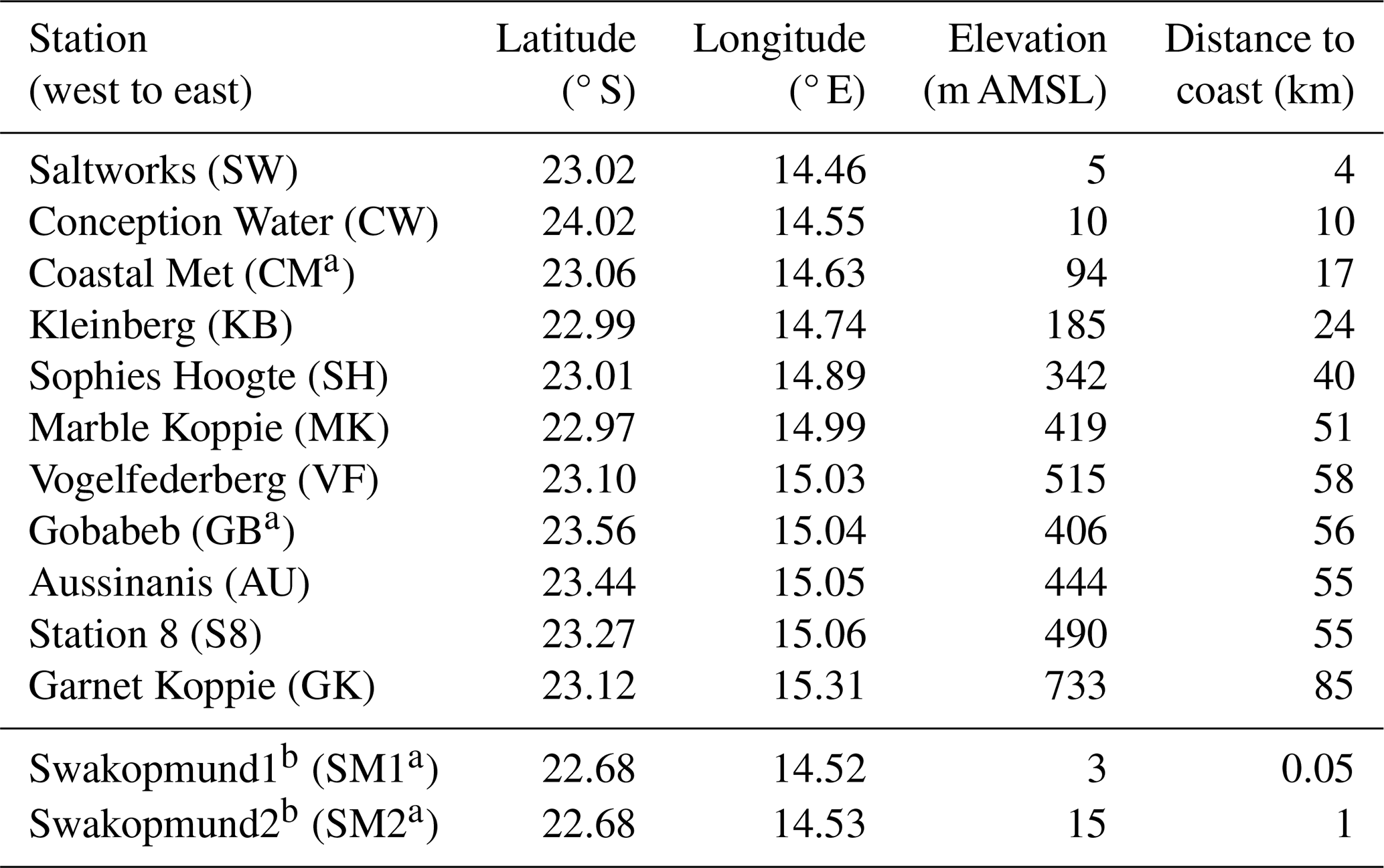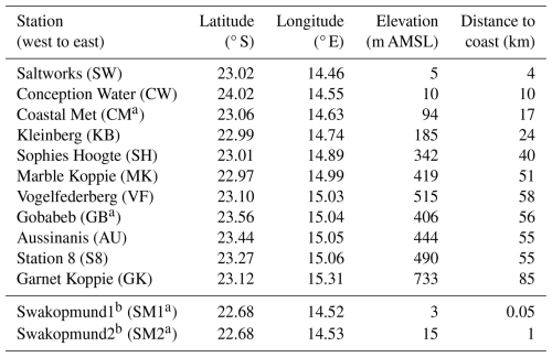 Table 2Latitude, longitude, elevation, and distance to the coast of the FogNet stations, sorted from west to east. Station positions are shown in Fig. 1.
