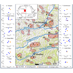 Figure 1Orographic map of the campaign area, highlighting the sub-surface gas fields (pink areas) and the sampling locations for the samples collected in this study. The 12 small dual isotope plots on the left and right indicate the distribution of the individual source signatures derived for the 12 gas fields that were visited. The orange diamond is a common reference point (δ13C = −65 ‰, δD = −185 ‰). (Location of the gas fields: modified after Map of the mineral resources, 1:1 000 000, Institute of Geology and Geophysics, Bucharest 1984).