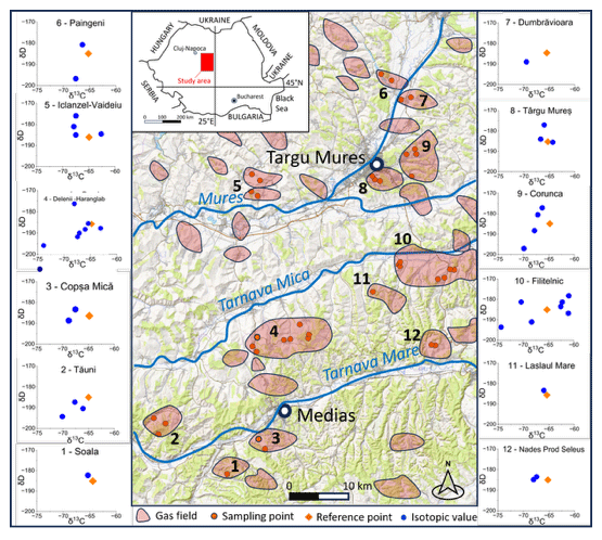 The Transylvania region is located in the central part of Romania, enclosed between the Apuseni Mountains in the West and the Eastern and Southern Carpathians. With over 100 gas fields scattered throughout the Transylvanian Basin, it remains the foremost gas producer among Central and South-Eastern European countries. The main petroleum system in the Transylvanian Basin corresponds to Neogene deposits, mainly hosting microbial methane (Popescu, 1995; Krézsek et al., 2010). Over the past century, it has yielded an estimated 30 TCF (trillion cubic feet) of gas (Krézsek, 2011), while undiscovered and confirmed reserves amount to approximately 20 TCF (Pawlewicz, 2005) (1 m3 = 35.315 cubic feet). There has been no discovery of commercial oil in the region of concern. Figure 1 shows the distribution of the gas reservoirs in the central-western part of the Transylvanian Basin, and the locations where air samples were collected for this study.