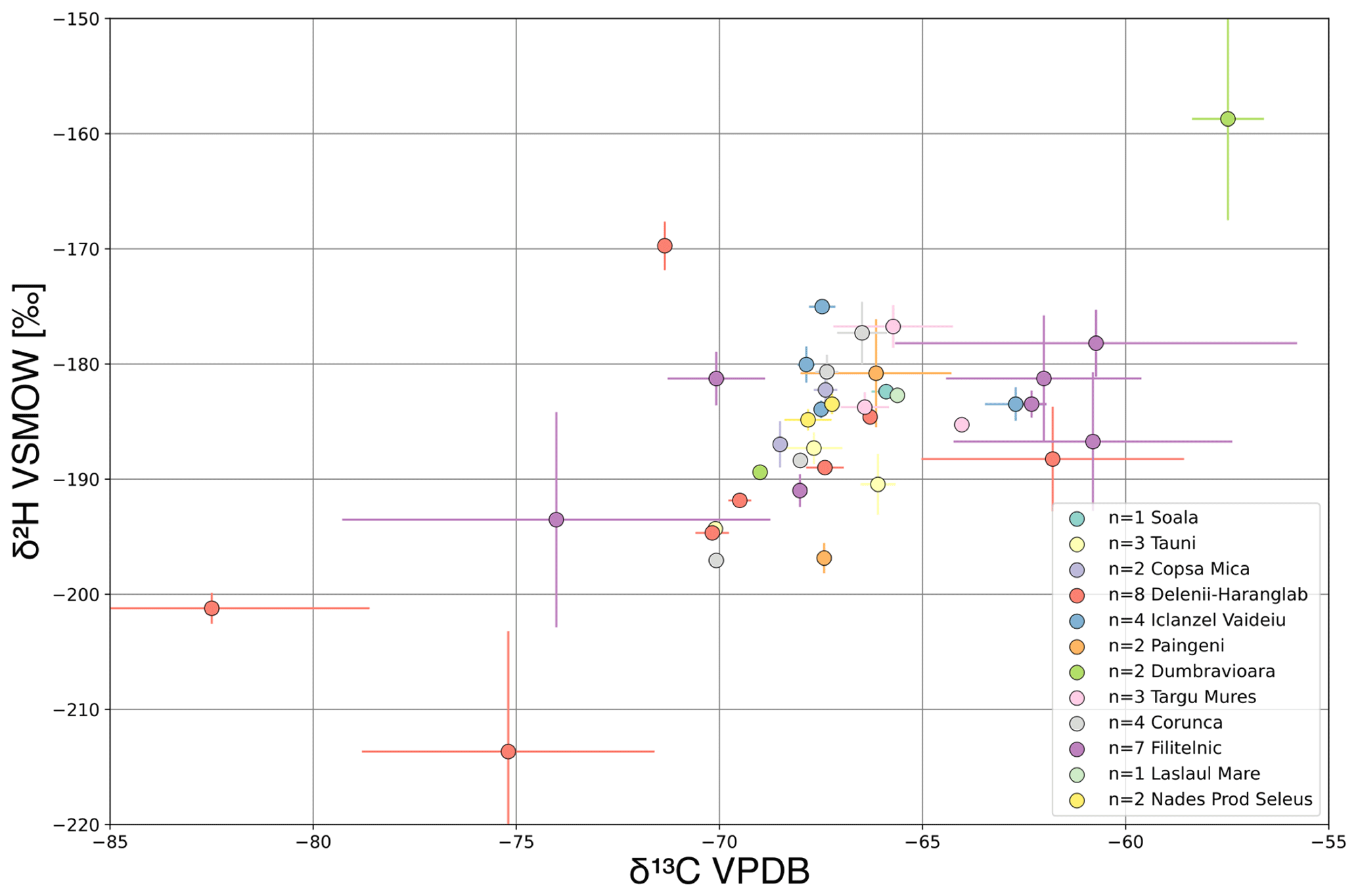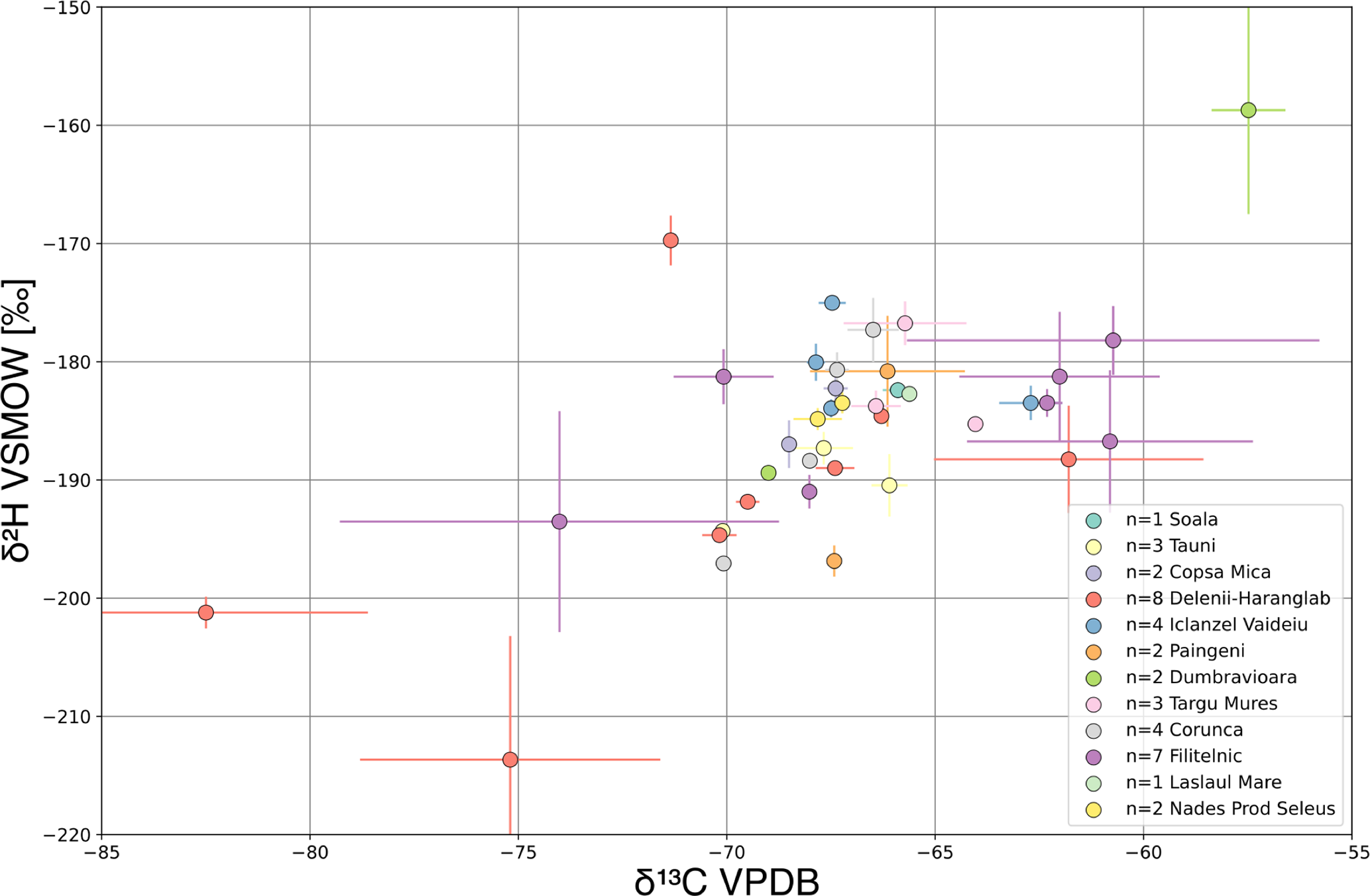 Figure 2Dual isotope plot (δD versus δ13C) of all individual isotope source signatures derived for the different sampling locations across the Transylvanian Basin. The different symbol colours represent different gas fields.