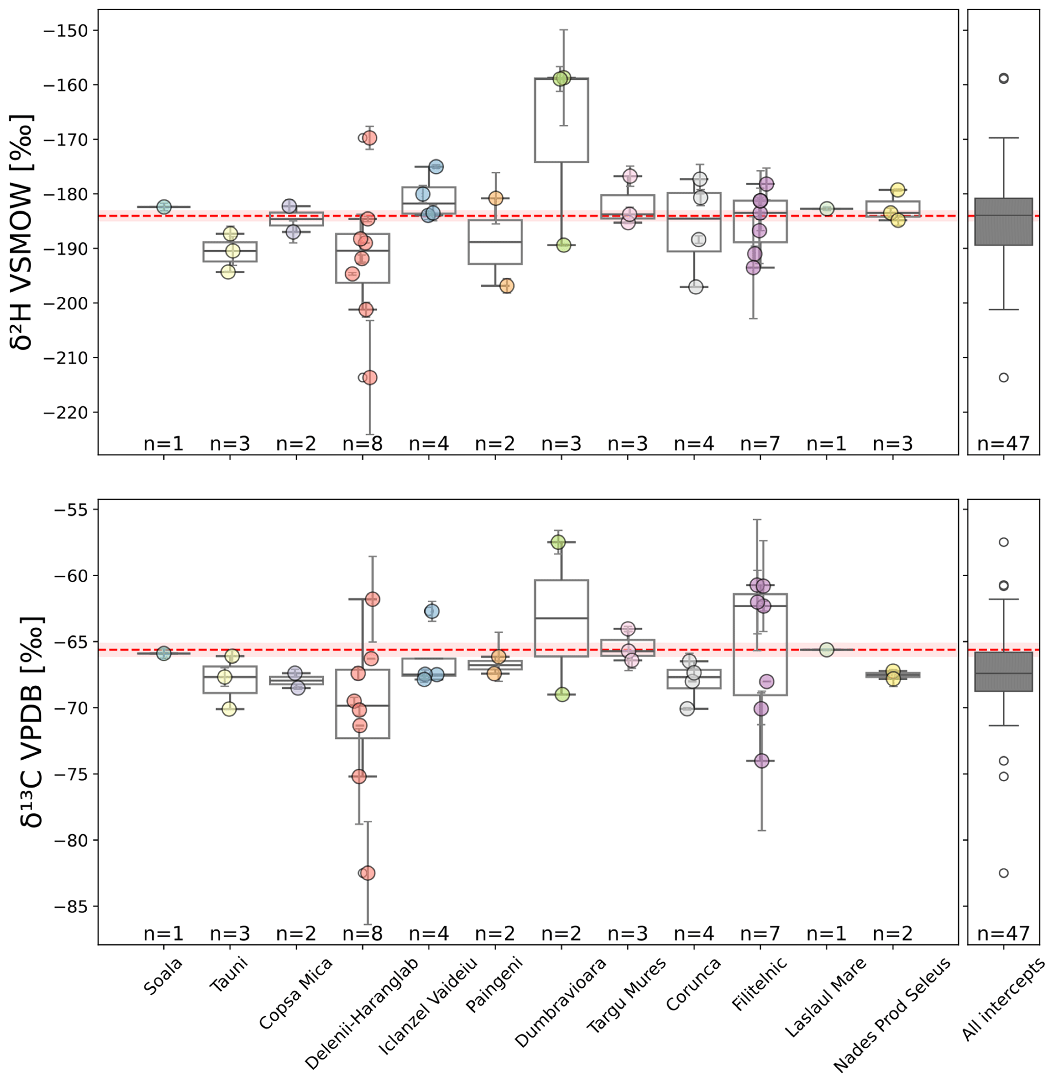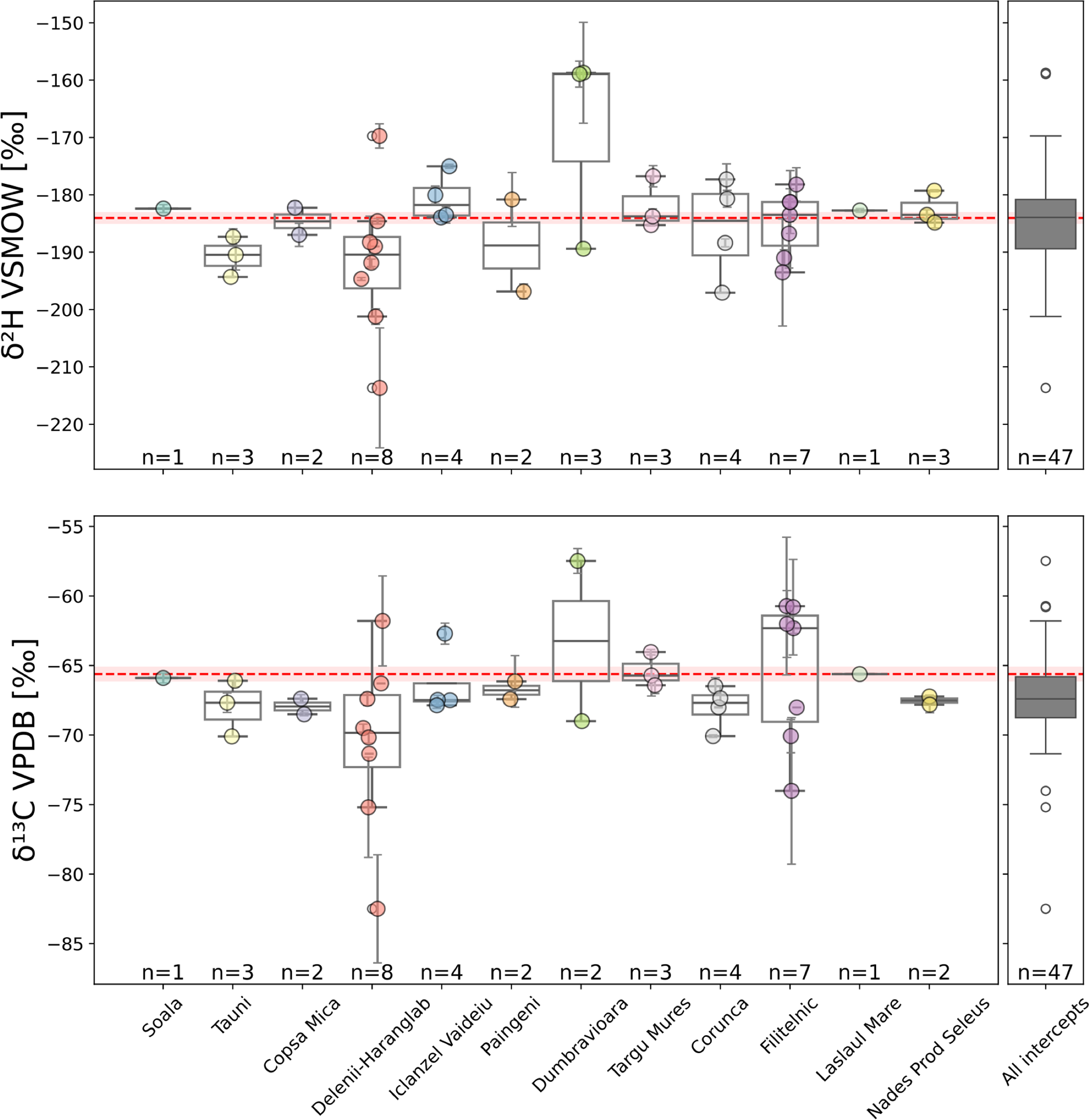 A Keeling analysis of all samples collected across the Transylvanian basin returns a y-axis intercept of δ13C = (−65.6 ± 0.5 ‰) and δD = (−184 ± 1 ‰), where the uncertainties state the 1σ uncertainty of the intercept. This is the average isotopic composition of the CH4 emitted from the investigated gas production installations across the Transylvanian basin. The complete dataset is available at https://doi.org/10.18160/4SJW-ST8W (Röckmann et al., 2025).