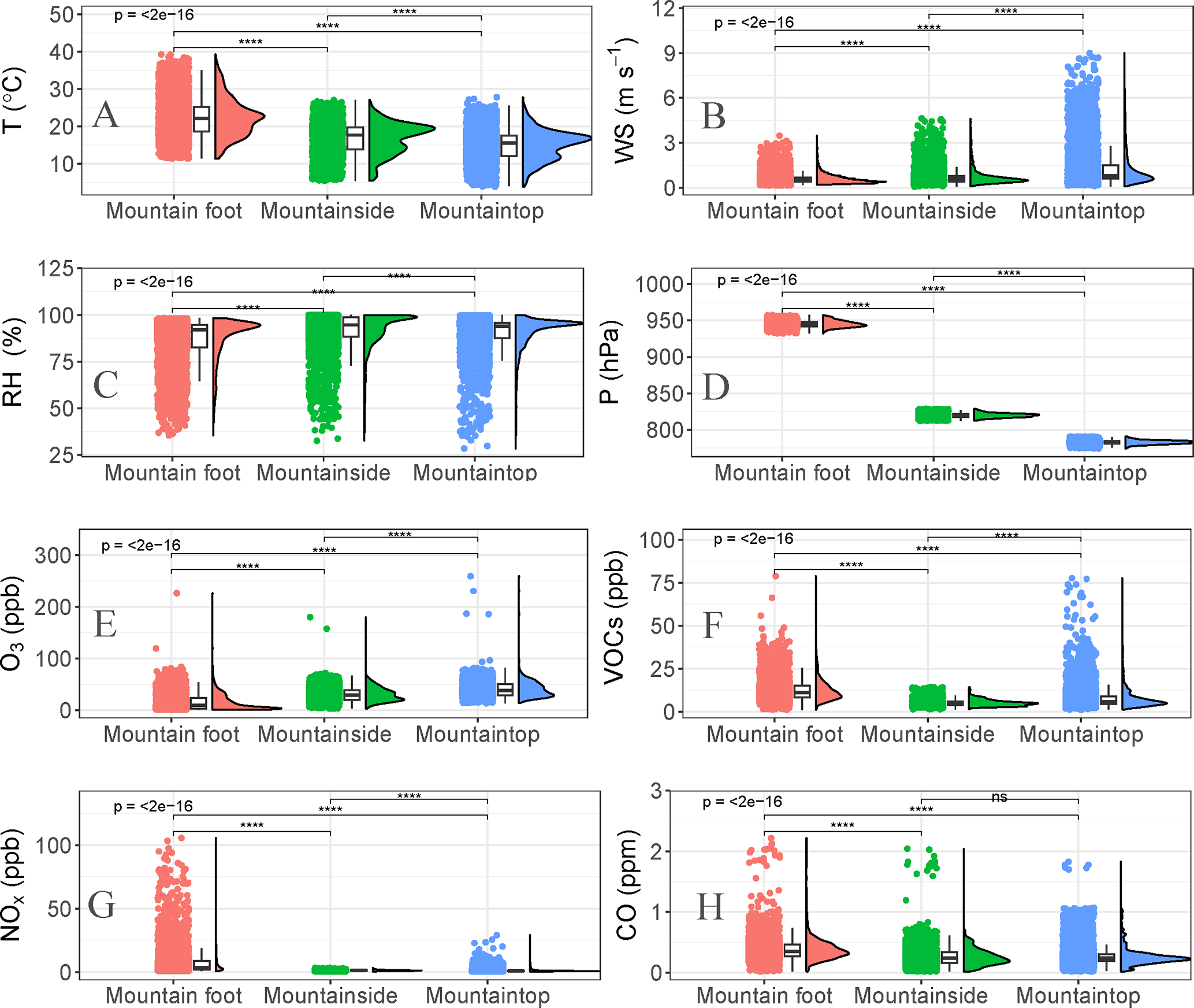 Mt. Fanjing exhibits a steep vertical meteorological gradient, manifesting as distinct conditions across altitudes: typically sunny conditions mountain foot, fog enveloping mountainside, and frequent rainfall at mountaintop (Figs. S1–S3 in the Supplement). Observational data revealed inverse altitudinal gradients for both wind speed and atmospheric pressure relative to temperature. Measured temperatures were 22.4 ± 5.1, 16.8 ± 4.2, and 15.0 ± 3.9 °C at mountain foot, mountainside, and mountaintop, respectively (Fig. 2A). Corresponding atmospheric pressures were 945 ± 4.5, 819 ± 2.8, and 783 ± 2.6 hPa (Fig. 2D), while corresponding wind speeds were 0.6 ± 0.4, 0.7 ± 0.6, and 1.4 ± 1.4 m s−1 (Fig. 2B). Relative humidity peaked at mountainside (91.7 ± 9.7 %), followed by the mountaintop (90.1 ± 9.7 %), and was lowest at mountain foot (86.5 ± 12.2 %) (Fig. 2C). These observed vertical gradients in meteorological parameters may govern O3 dynamics through modulation of both in-situ photochemical processes and advective transport mechanisms.