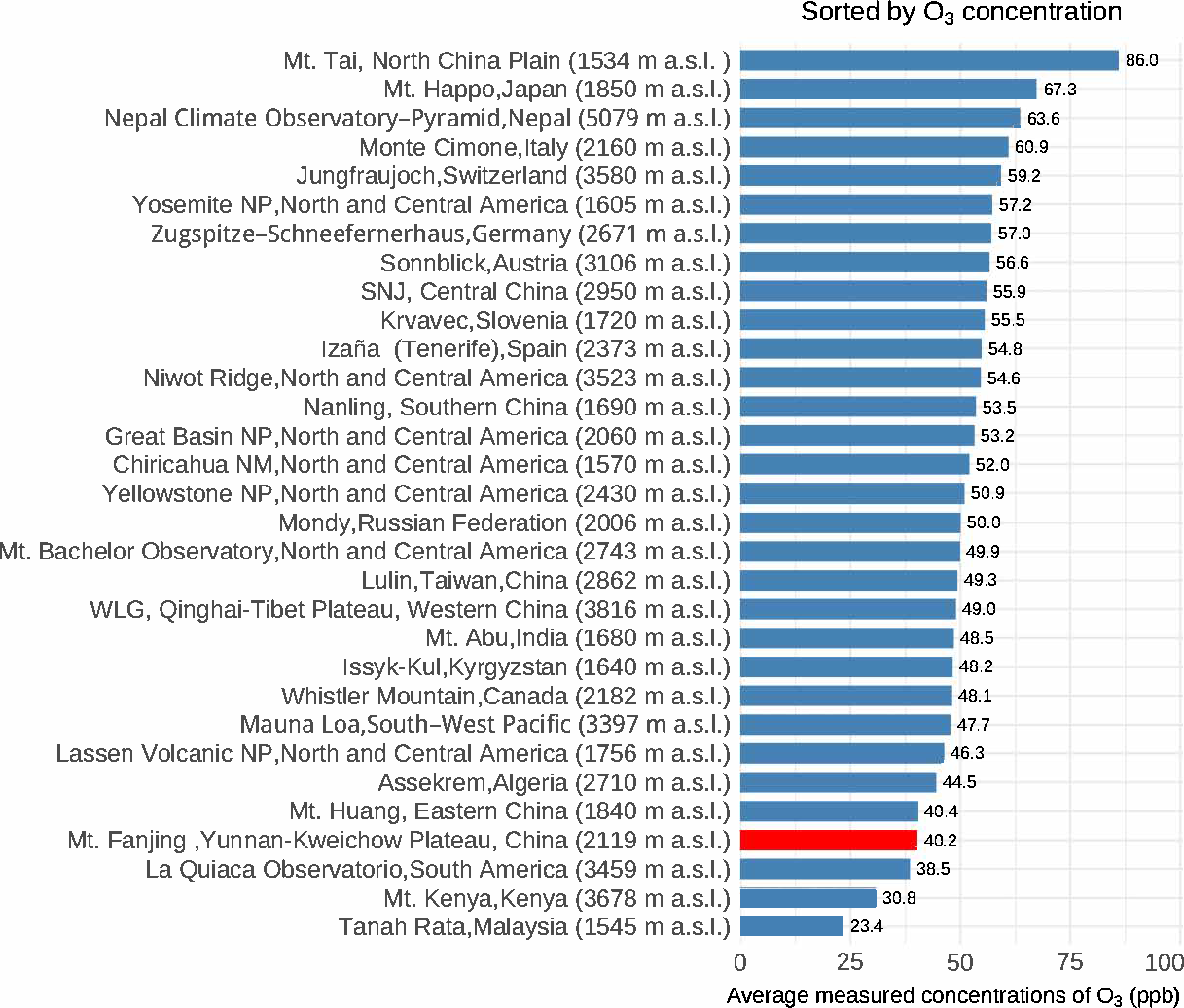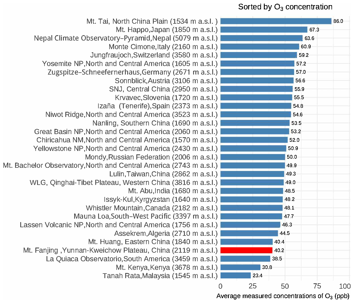 Figure 3Comparison of O3 concentrations at the summit of Mt. Fanjing (March–August 2024) with those recorded at mountain sites worldwide. The sites are arranged in descending order of O3 concentration, with each entry including the elevation in meters above sea level (m a.s.l.). All average values are reported in ppb. Data were compiled from published literature (Okamoto and Tanimoto, 2016; Li et al., 2007; Lyu et al., 2021; Xu et al., 2016; Gong et al., 2018; Sun et al., 2016). Most values correspond to summer or annual averages for the specific study periods cited. Despite inherent inter-annual variability, this comparison provides a useful context for positioning Mt. Fanjing within the global range of high-altitude background O3 levels.