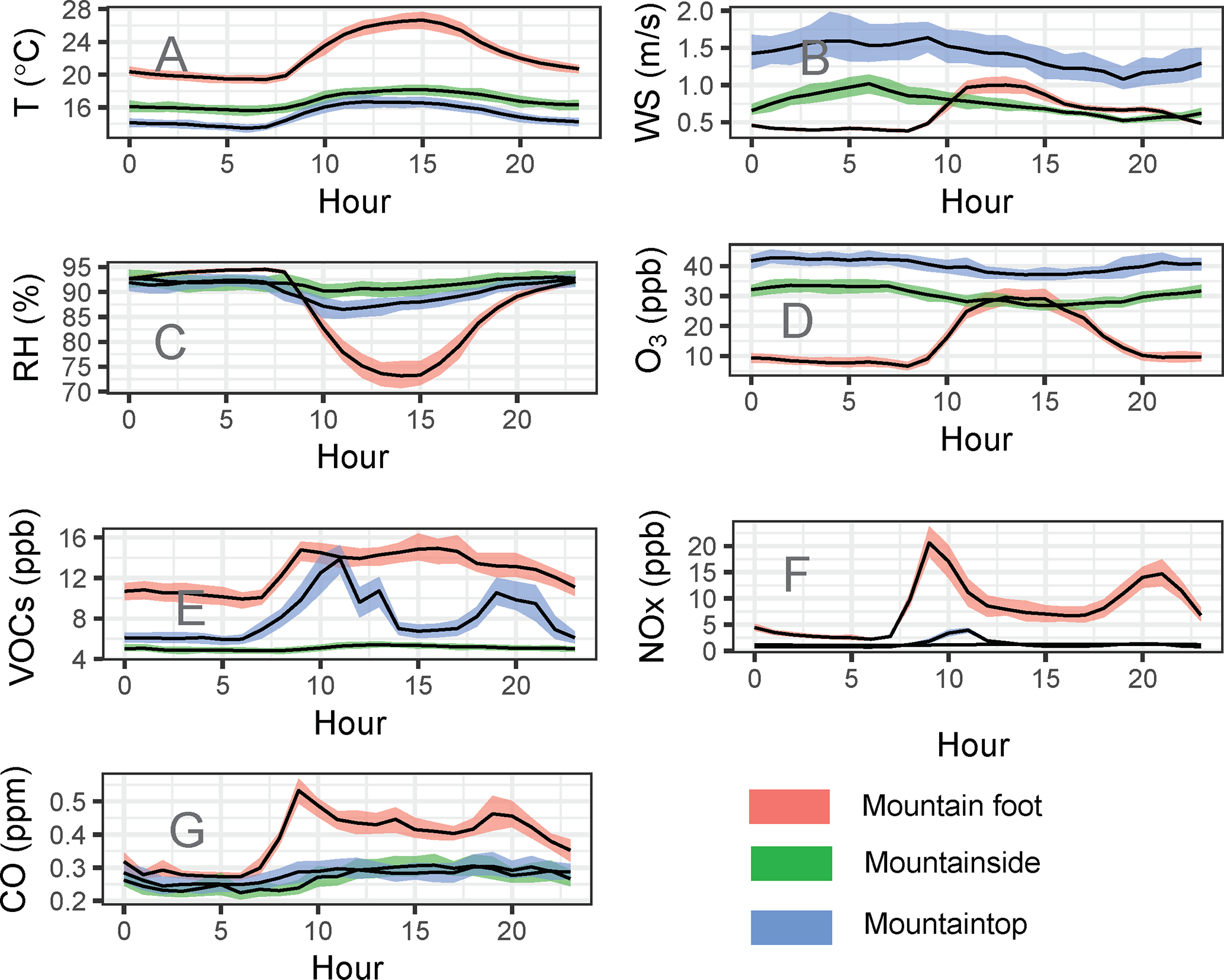 Figure 4Diurnal variations in O3 and its precursors, and meteorological parameters across the respective elevation sites throughout the observational period. Hourly means are represented by solid lines, with shaded areas denoting 95 % confidence intervals.