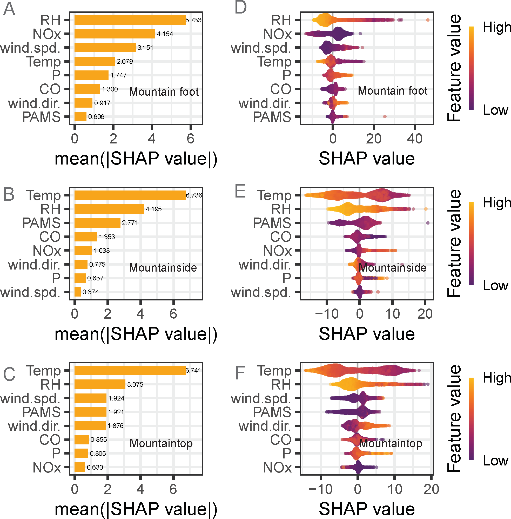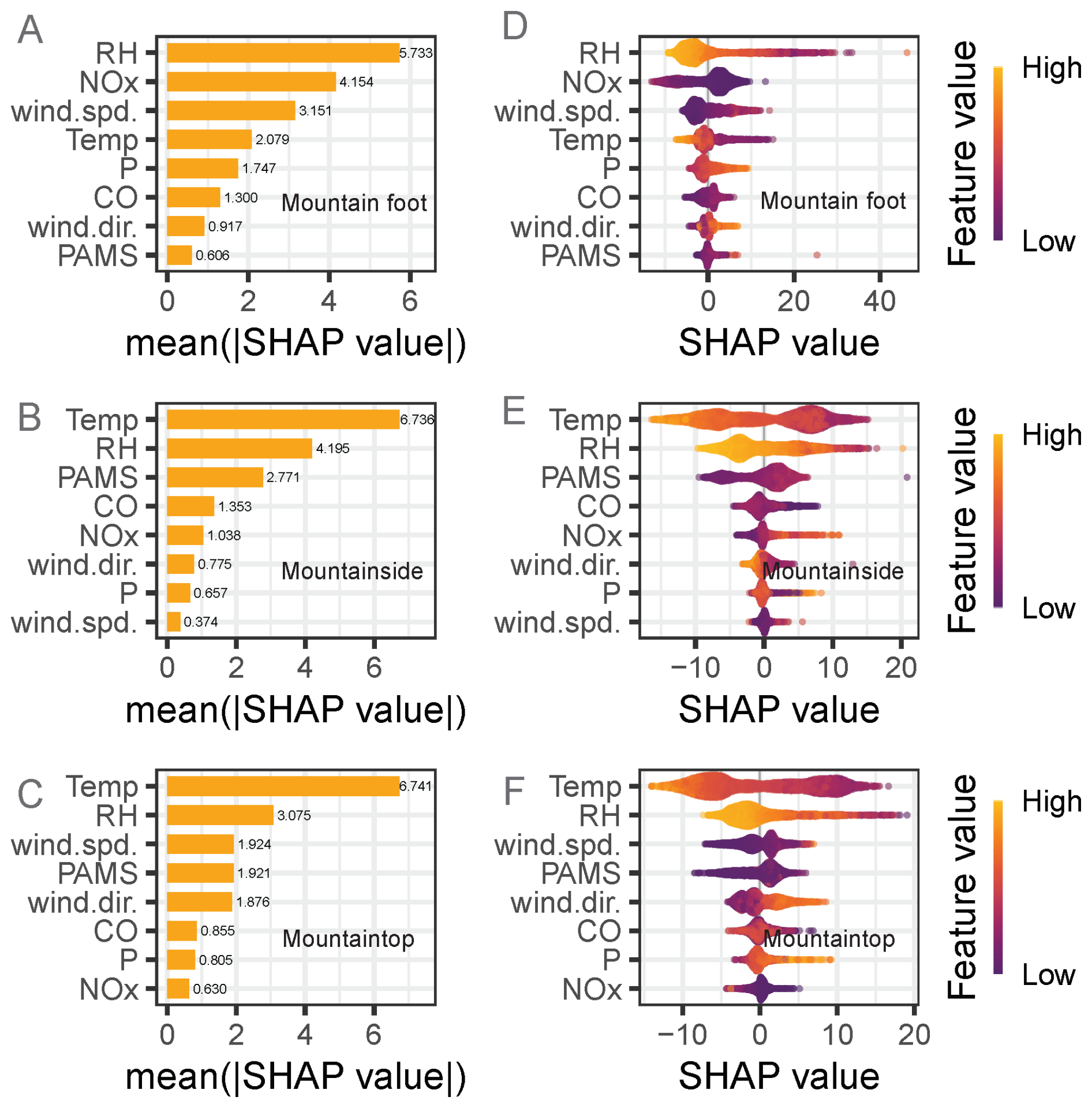 The feature importance ranking for O3 as the dependent variable is presented in Fig. 5A–C. The top five features were: relative humidity, NOx, wind speed, temperature, and pressure at mountain foot (Fig. 5A); temperature, relative humidity, VOCs, CO, and NOx at mountainside (Fig. 5B); and temperature, relative humidity, wind speed, VOCs, and wind direction at mountaintop (Fig. 5C). Overall, meteorological factors exerted a consistently greater overall influence than chemical factors, underscoring the significance of meteorological factors in O3 variability across the elevation gradient. Figure 5D–F displays SHAP summary plots for key features within the random forest model, corresponding to the mountain foot, mountainside, and mountaintop, respectively. These plots characterize the relative influence magnitude, feature prevalence, and effect direction of each variable on predicted O3 concentrations. SHAP values farther from zero denote stronger feature importance; positive values indicate a positive association with O3 levels, whereas negative values reflect an inverse relationship. For instance, elevated relative humidity corresponds to diminished SHAP values, indicating an inverse correlation between relative humidity and O3 concentration. This likely arises from the complex interplay of physical and chemical processes, such as cloud–radiation interactions, air mass transport, and aqueous-phase chemistry (Liu et al., 2025; Luo et al., 2025).
