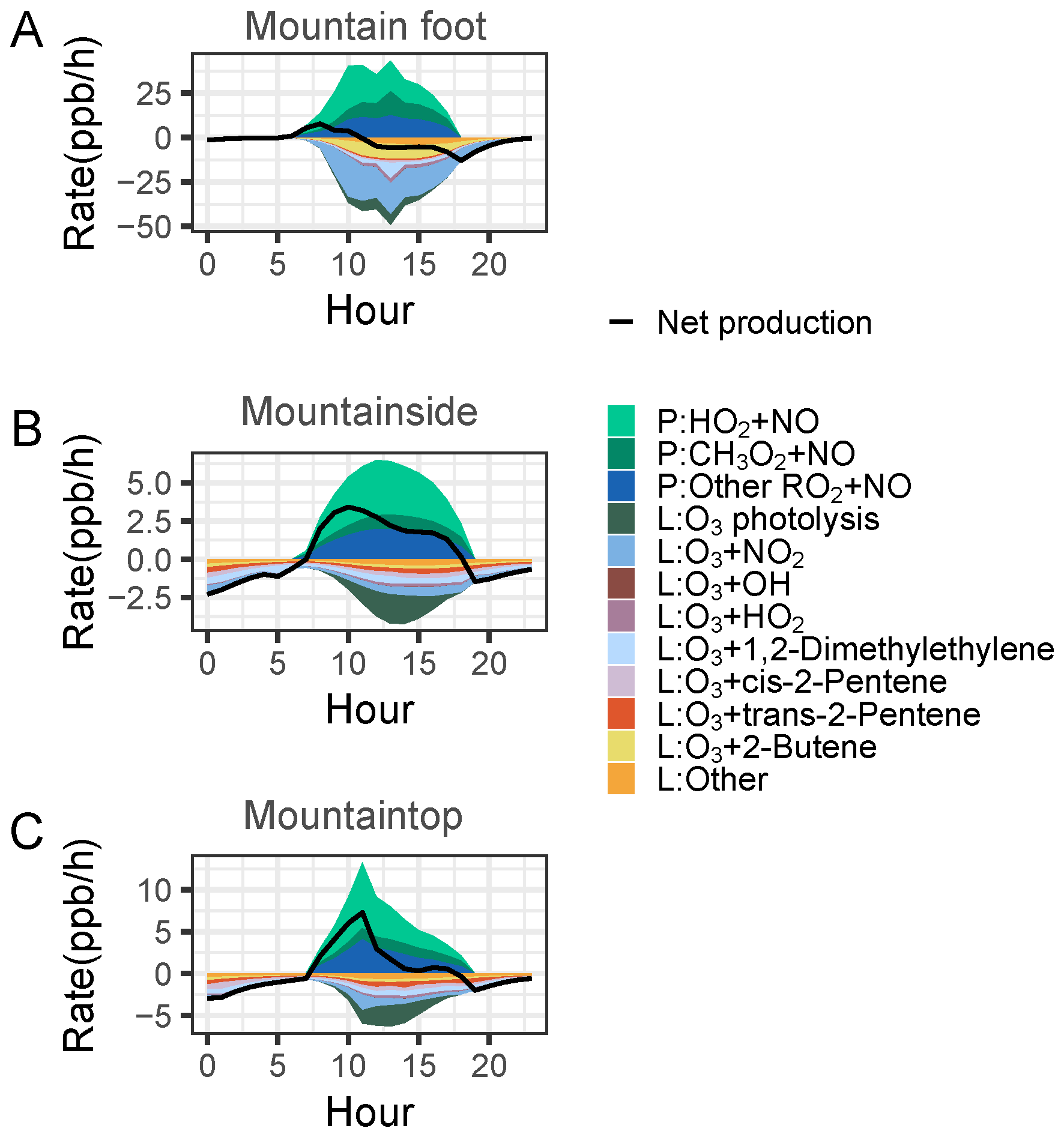 Reaction rates substantially influencing O3 production or destruction are summarized in Table 1 on a daily average basis. O3 production rates peaked at mountain foot (12.83 ppb h−1), significantly exceeding values observed at mountainside (2.29 ppb h−1) and mountaintop (2.92 ppb h−1). This vertical gradient arises primarily from variations in NO concentrations, with significantly higher NO emission intensities at mountain foot-driven by anthropogenic activities-compared to mountainside and mountaintop. Elevated NO concentrations accelerate HO2 and RO2 reactions with NO, thereby promoting radical cycling rates and consequently amplifying O3 production (Wu et al., 2024; Ma et al., 2002). The HO2 + NO reaction dominated O3 production pathways across all sites, with mean rates of 6.09 ppb h−1 (47.5 %), 1.23 ppb h−1 (53.8 %), and 1.48 ppb h−1 (50.8 %) at mountain foot, mountainside and mountaintop, respectively. The RO2 + NO and CH3O2 + NO reactions constituted the secondary pathways. Corresponding mean rates were 3.80 and 2.94 ppb h−1 (29.6 % and 22.9 %) at mountain foot, 0.71 and 0.35 ppb h−1 (31.1 % and 15.1 %) at mountainside, and 0.98 and 0.46 ppb h−1 (33.4 % and 15.8 %) at mountaintop. The O3 removal rate reached 14.77 ppb h−1 at mountain foot, significantly higher than rates observed at mountainside (1.94 ppb h−1) and mountaintop (2.64 ppb h−1) (Table 1). The dominant removal pathway at mountain foot was the reaction of O3 with NO2 (7.14 ppb h−1), accounting for 48.3 % of the total removal. This was followed by reactions with 2-Butene (2.79 ppb h−1, 18.9 %) and photolysis (O3 + hν, 1.36 ppb h−1, 9.2 %). In marked contrast, O3 + hν was the primary removal mechanism at both mountainside and mountaintop, with mean daily rates of 0.43 ppb h−1 (22.3 %) and 0.54 ppb h−1 (20.4 %), respectively. Secondary pathways included O3 + NO2 (0.36 ppb h−1, 18.4 % at mountainside; 0.43 ppb h−1, 16.3 % at mountaintop) and O3 + 1,2-Dimethylethylene (0.32 ppb h−1, 16.4 % at mountainside; 0.38 ppb h−1, 14.5 % at mountaintop). This vertical variation is primarily attributed to altitudinal gradients in meteorological parameters (temperature, and solar irradiation) and precursor concentrations. Figure 8 depicts the campaign-mean diurnal cycle of O3 production, destruction, and net rates at mountain foot, mountainside, and mountaintop. One can see that both O3 production and destruction occur concurrently during the daytime, peaking around solar noon. At mountain foot, O3 destruction exceeded production, resulting in net O3 destruction with a rate of 1.93 ppb h−1 (Fig. 6A and Table 1), contrasting with net O3 production at mountainside (0.35 ppb h−1) (Fig. 6B and Table 1) and mountaintop (0.29 ppb h−1) (Fig. 6C and Table 1). These values were significantly lower than those recorded at Mount Tai (7.4 ppb h−1 at mountain foot, 5.6 ppb h−1 at mountainside and 6.4 ppb h−1 at mountaintop) (Kanaya et al., 2009; Wu et al., 2024), comparable to measurements at Jungfraujoch for midday in winter, spring, and summer (from −0.05 to +0.4 ppb h−1) (Parker et al., 2009; Zanis et al., 2003), but substantially higher than the data obtained from Mt. Cimone in June (2–3 ppb d−1) (Fischer et al., 2003) and Mauna Loa for four seasons (from −0.8 to −0.4 ppb d−1) (Cantrell et al., 1996). The peak net O3 production at mountain foot occurred around 08:00 (4.4 ppb h−1), approximately 2–3 h earlier than that observed at mountainside (3.4 ppb h−1) and mountaintop (7.3 ppb h−1), respectively. This temporal offset may be linked to differences in the timing of precursor accumulation driven by boundary-layer development and tourist activity.